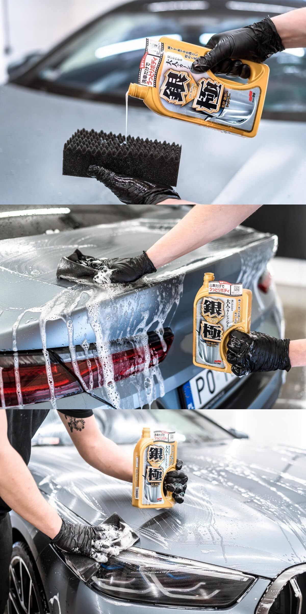 2. 搖均瓶身,將液體直接倒在浸溼的內附海綿上,擠壓使其產生豐富泡沫後,塗抹於車身進行洗車。泡沫減少或污無法清除的部位,請多倒些液體。
