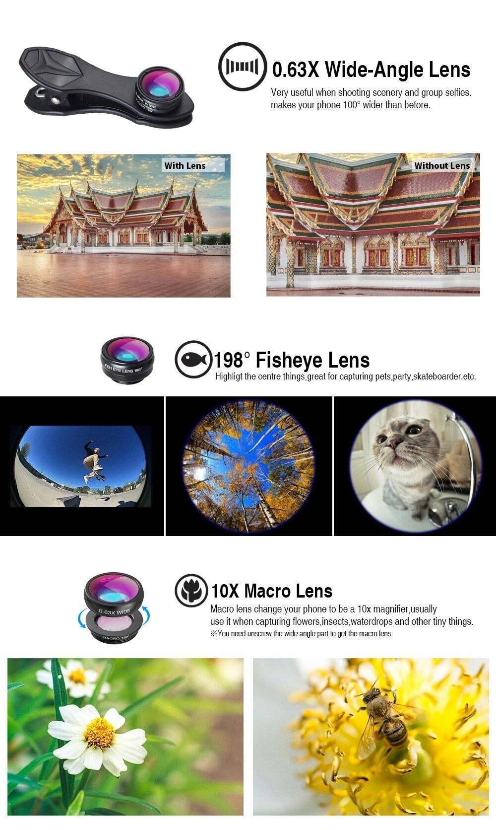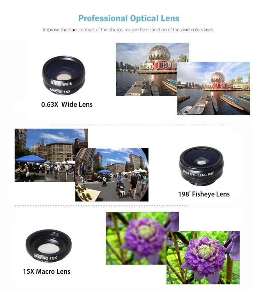 - 包裝內容:1 x 18倍望遠鏡鏡頭, 1 x 鏡頭尾蓋, 1x 0.63x廣角15x微距鏡頭, 1 x198°魚眼鏡頭, 1 x鏡頭夾, 1 x眼罩, 1 x八爪魚三腳架, 1 x手機拉夾, 1 x藍牙快門, 1 x清潔布, 1 x防水布袋, 1 x說明書