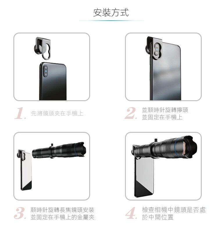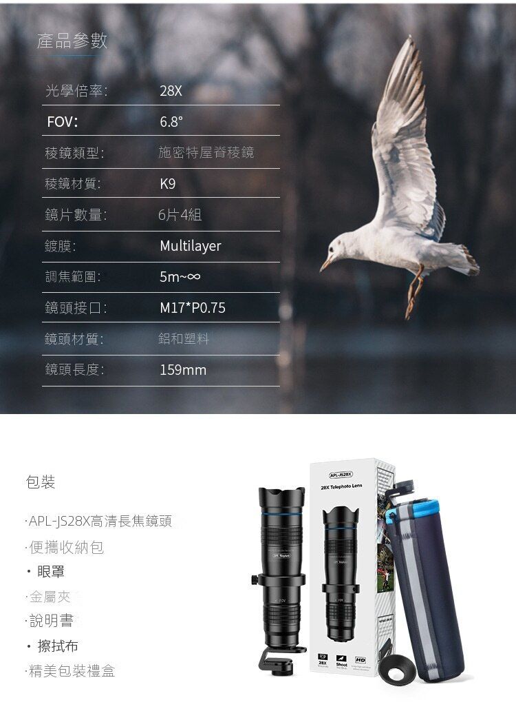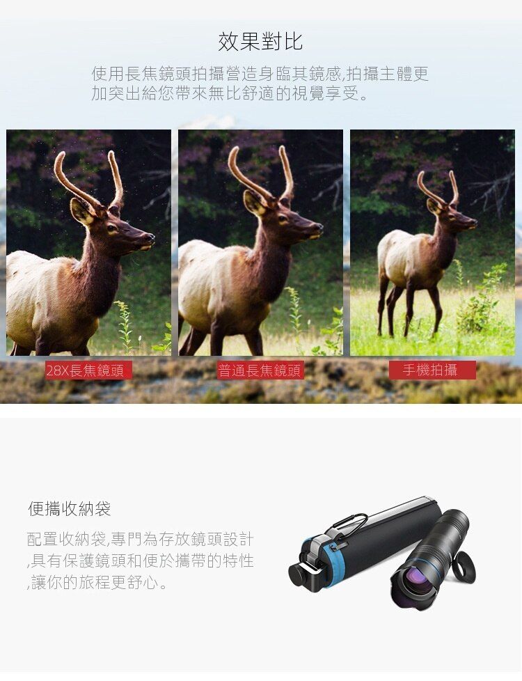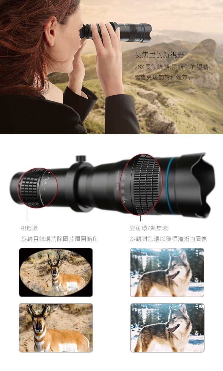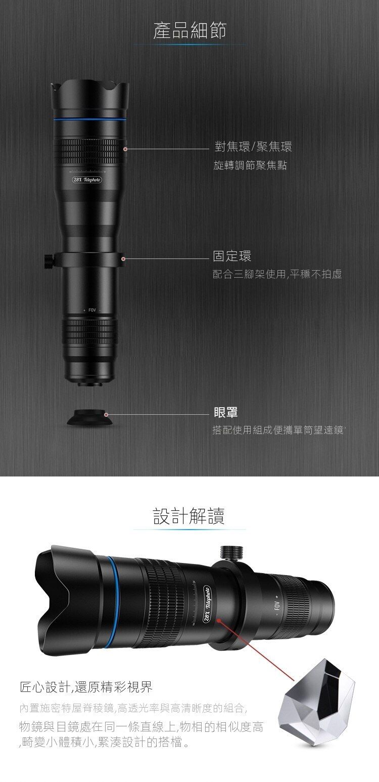 手機攝影長焦鏡頭,全套專利設計放大倍率28倍,全金屬鏡身,光學玻璃鍍膜+BK4棱鏡組合,高清分辨率,相對照度清晰,大通光棱境透光效果好。通用可拆卸螺絲固定專利夾設計,適合大部分智慧型手機、操作簡單方便。