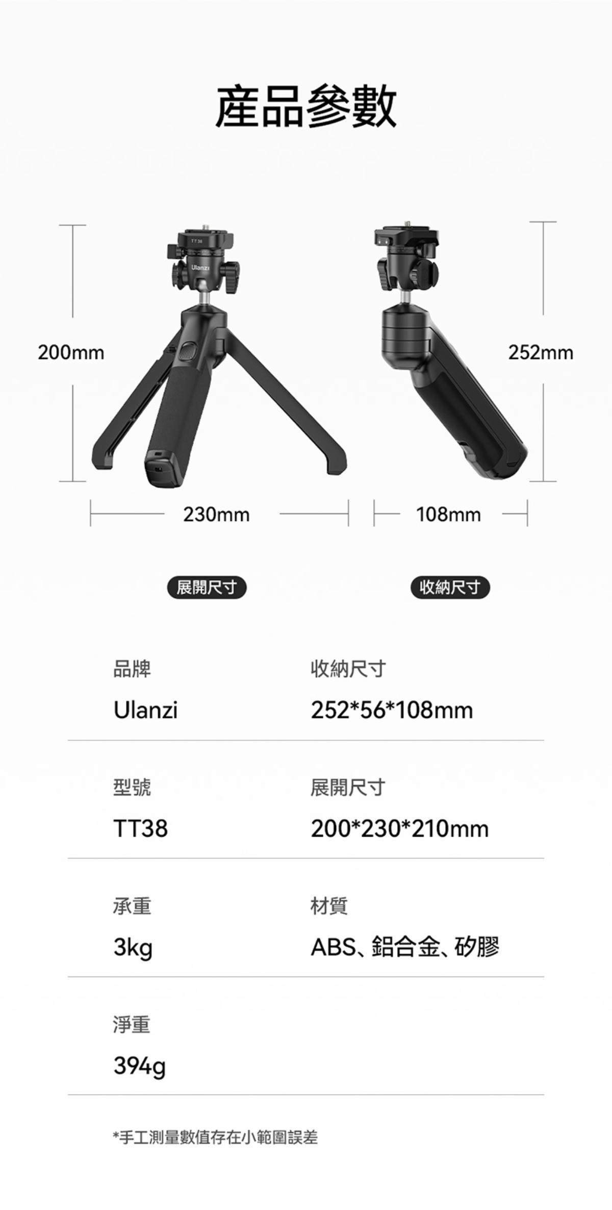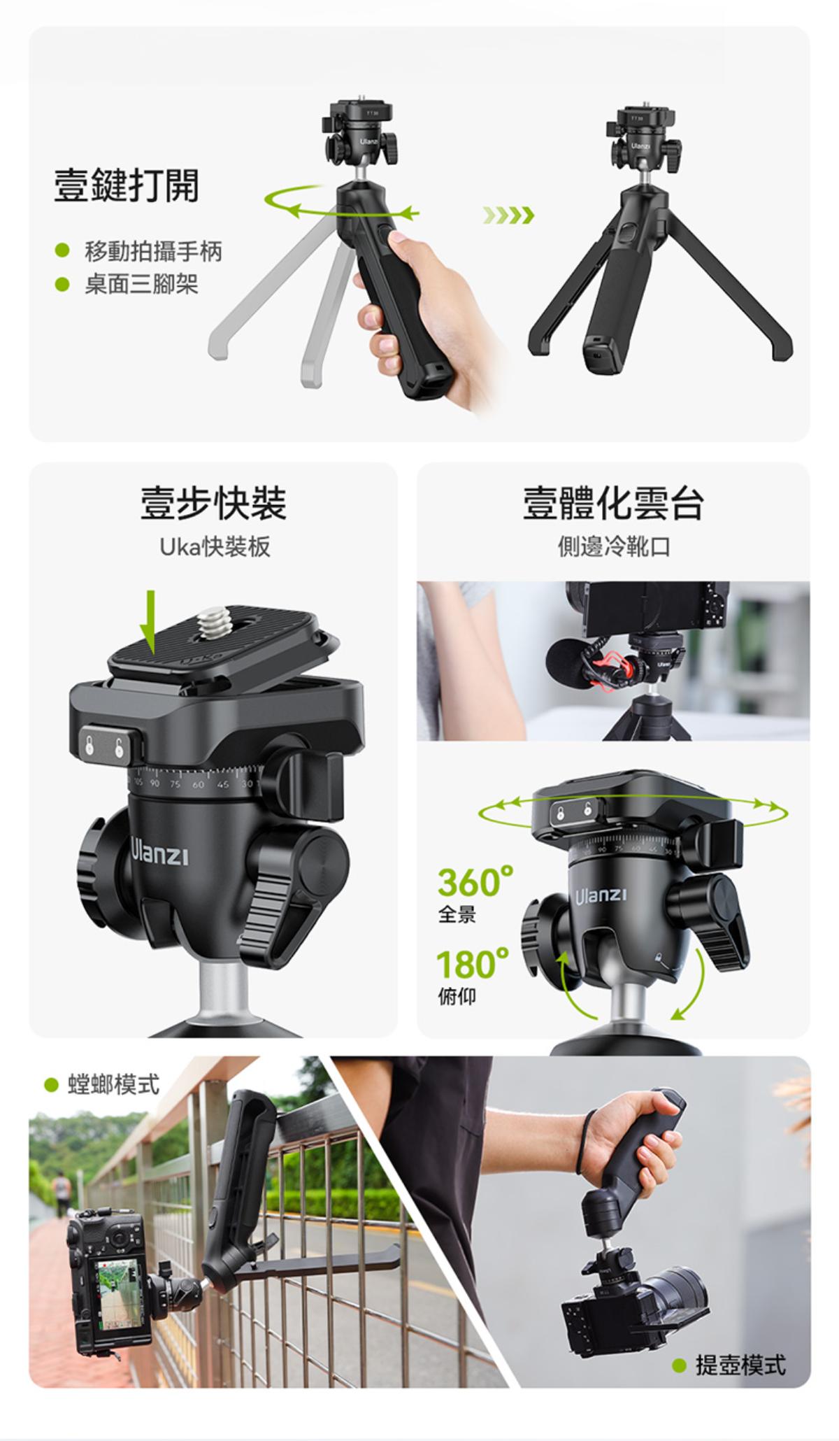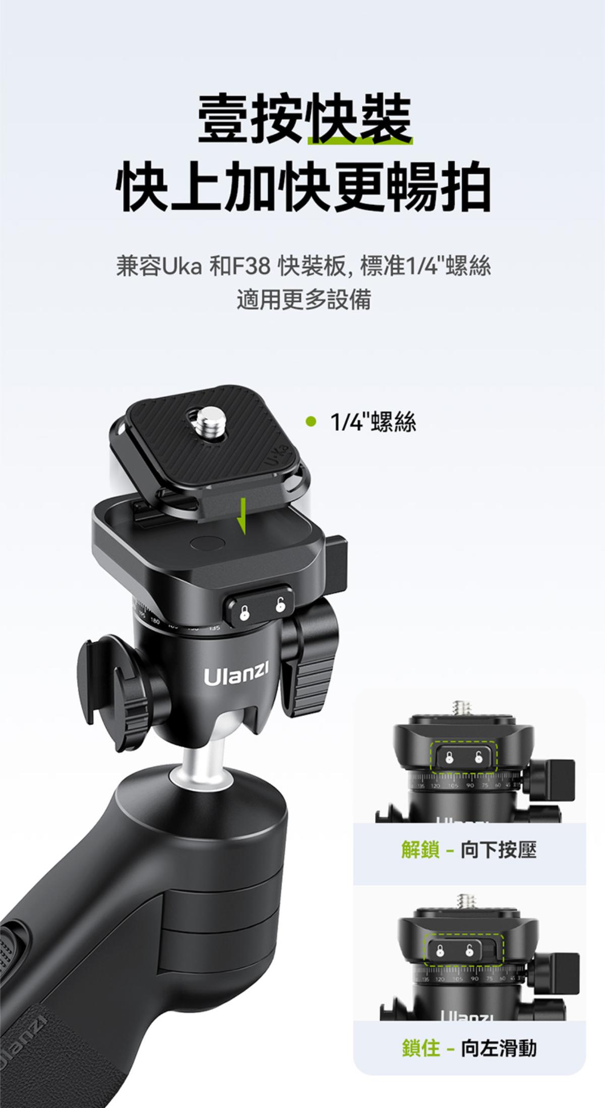 - 一體化雲台設計,兼容Uka和F38快裝板,標準1/4″螺絲適用更多設備