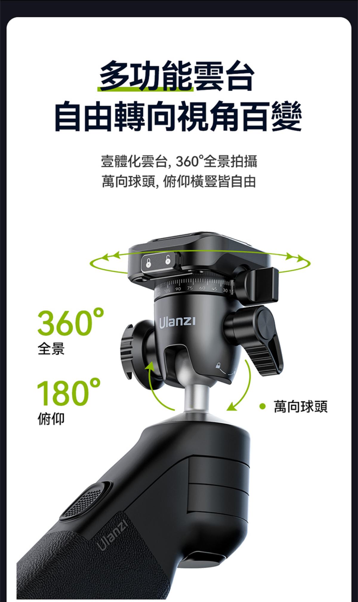 - 大角度開合,360°全景拍攝,萬向球頭自由轉向