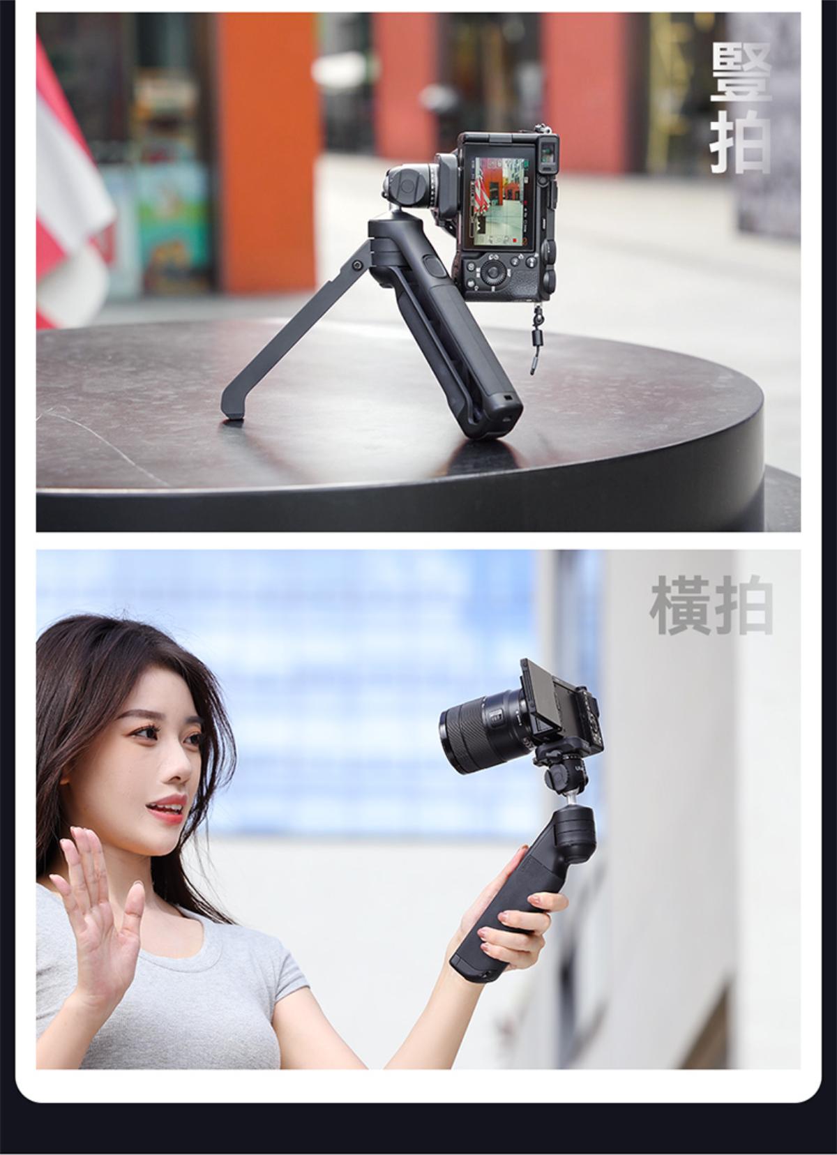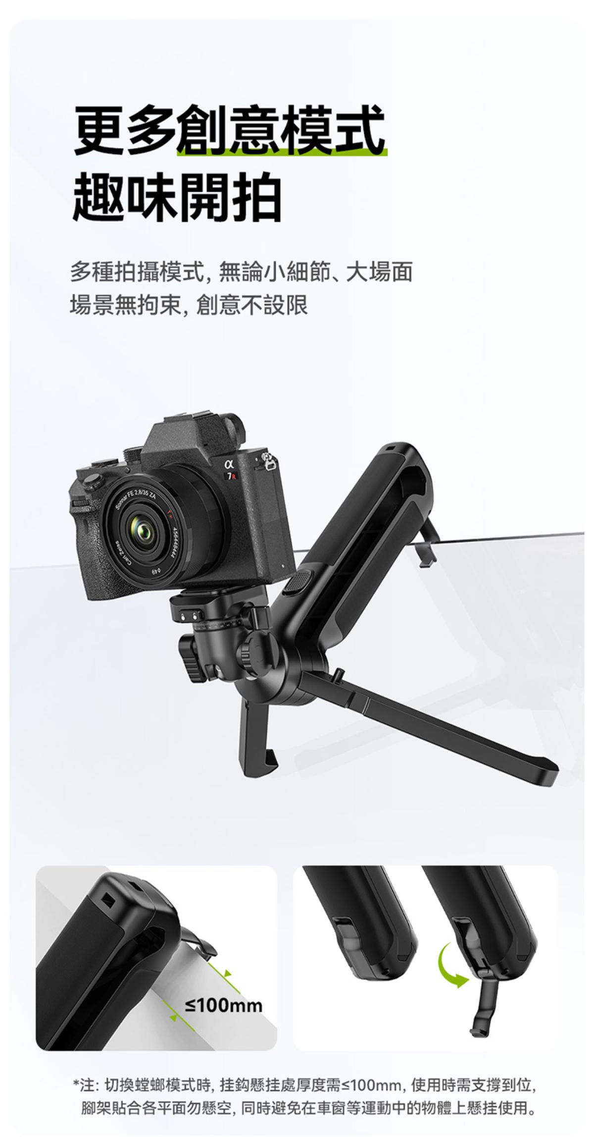 - 特殊功能:一鍵打開三腳架形態、提壺模式、底部隱藏掛鉤、側邊冷靴口