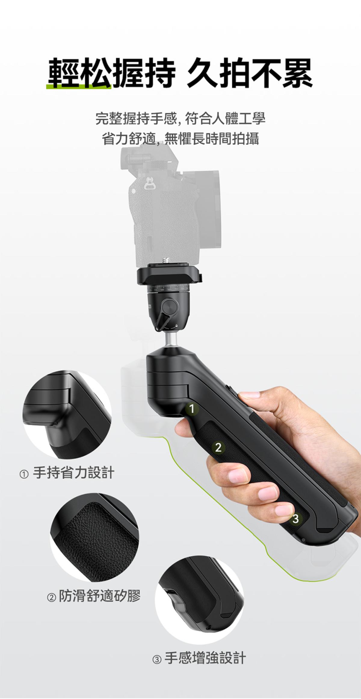 - 符合人體工學設計,輕鬆握持,持久拍攝不累