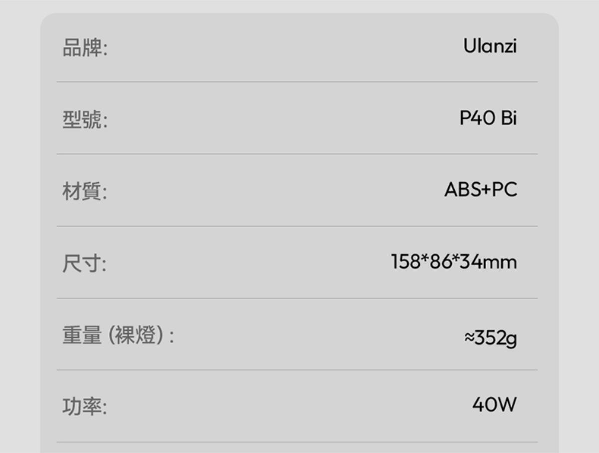 - 重量(裸燈):約352g(P40 Bi)/ 約408g(P40 RGB)