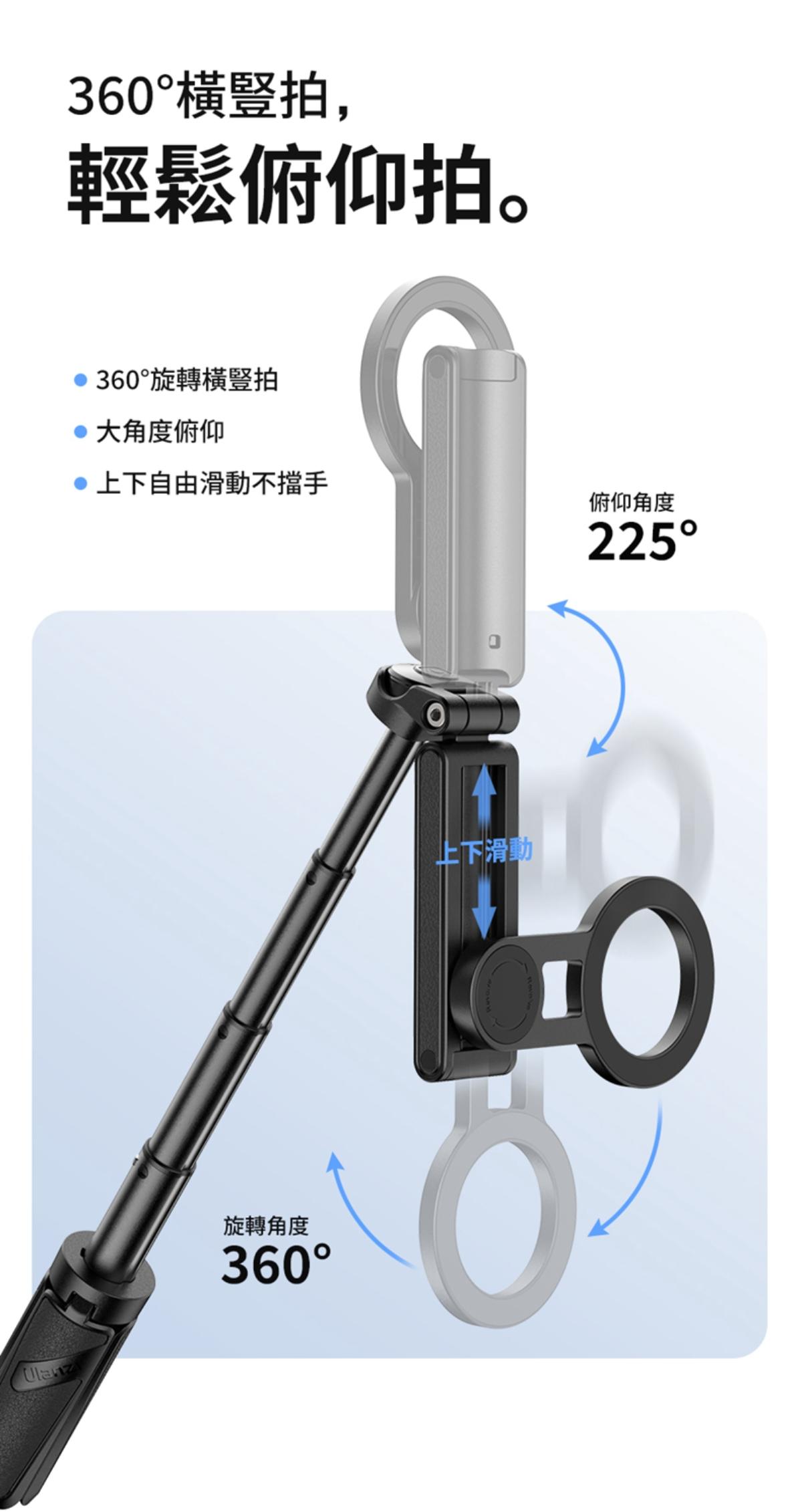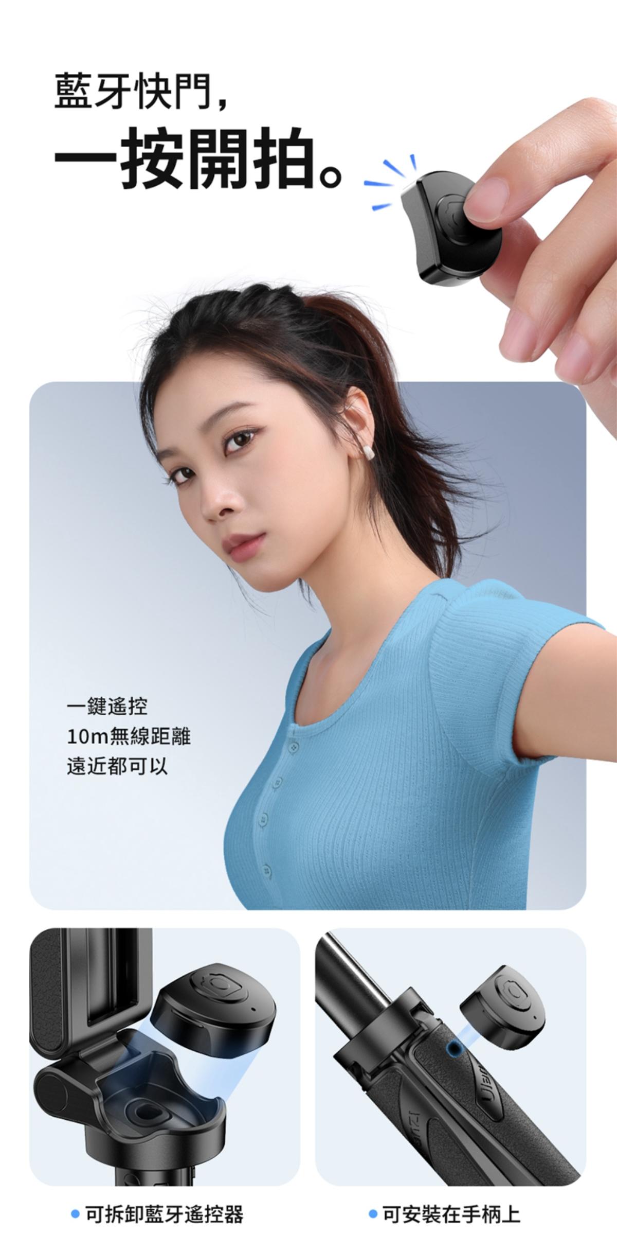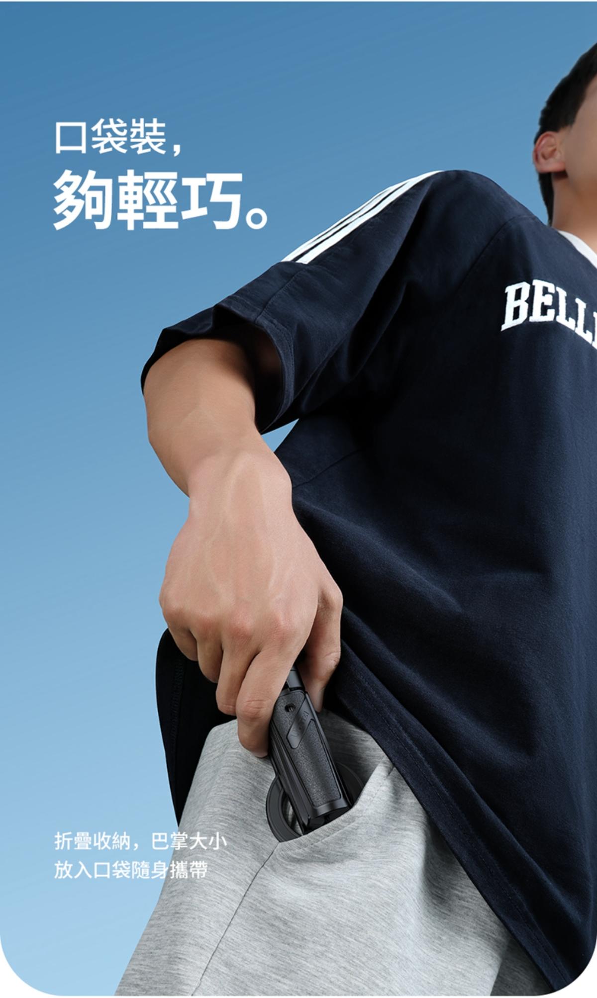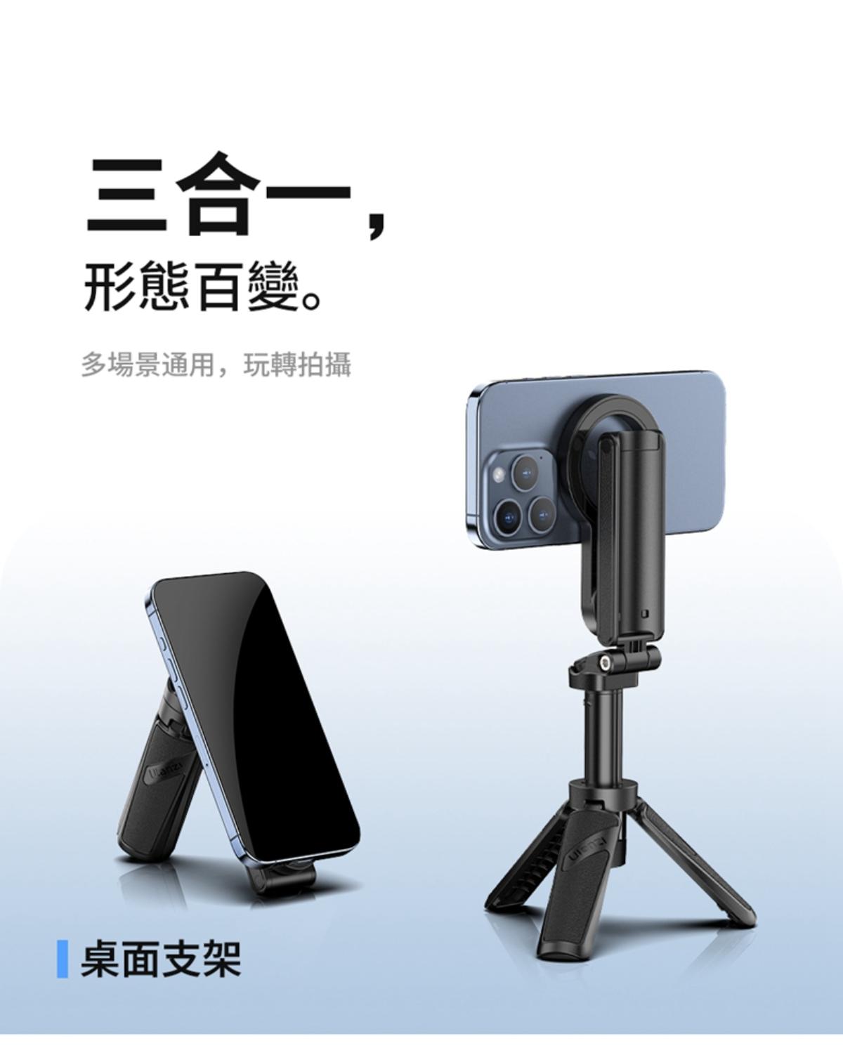 - 三合一多功能設計,支援桌面支架、自拍杆和助拍手柄