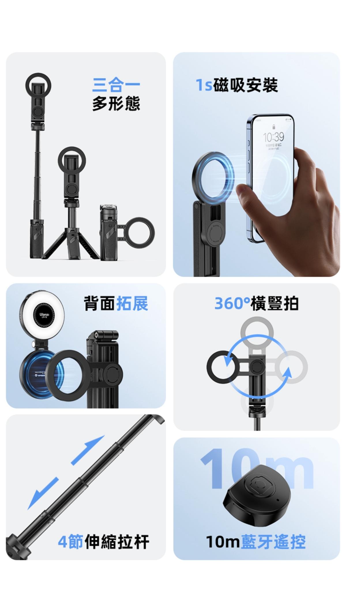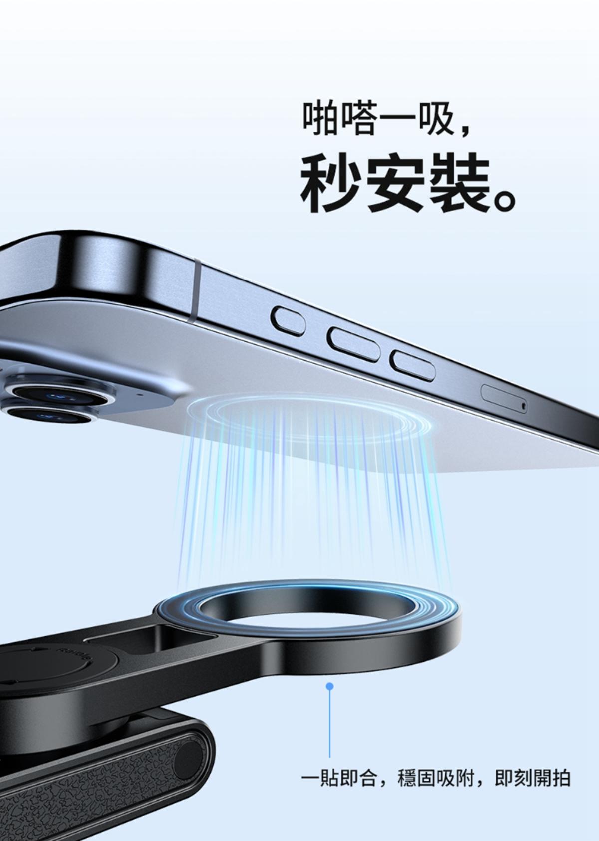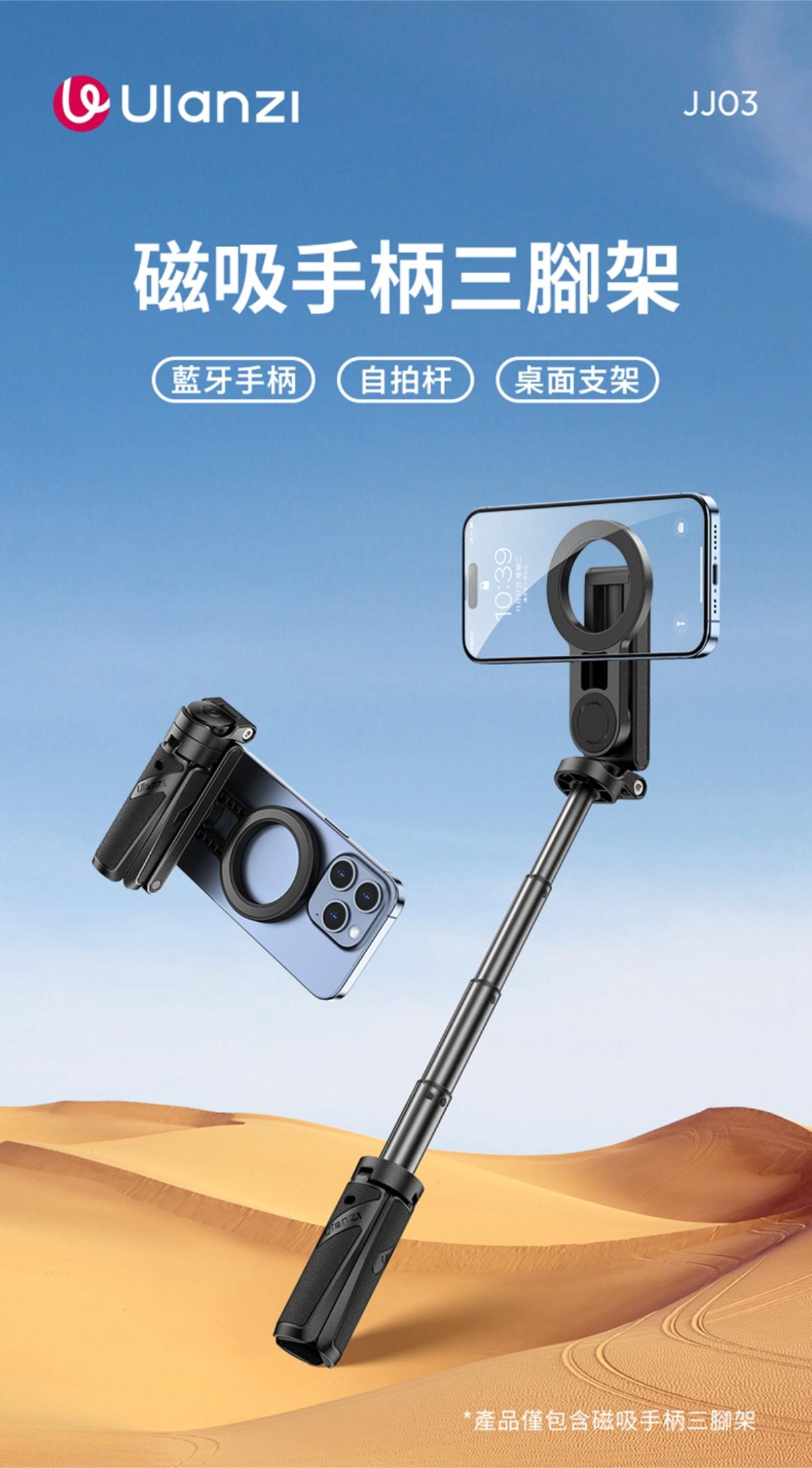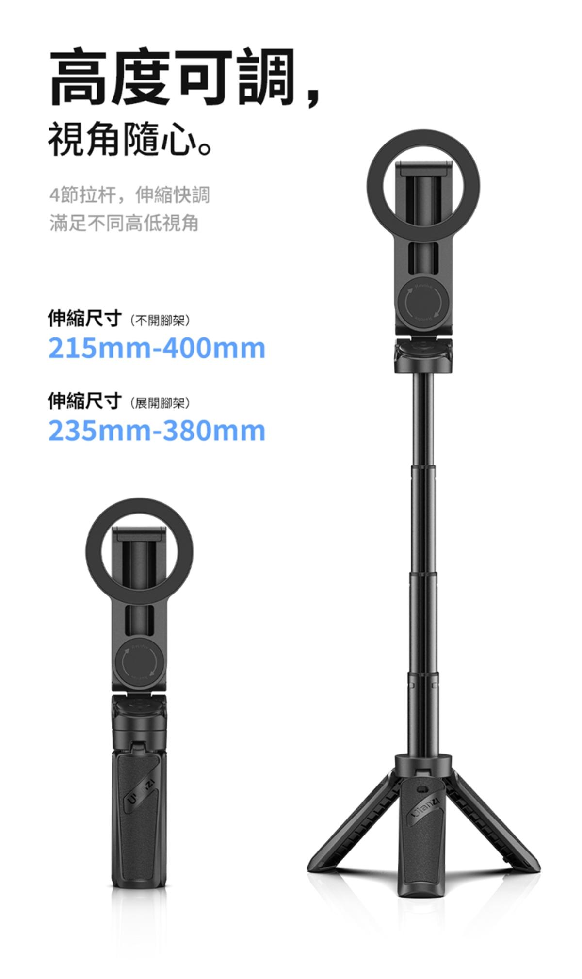 - 三合一多功能設計,支援桌面支架、自拍杆和助拍手柄