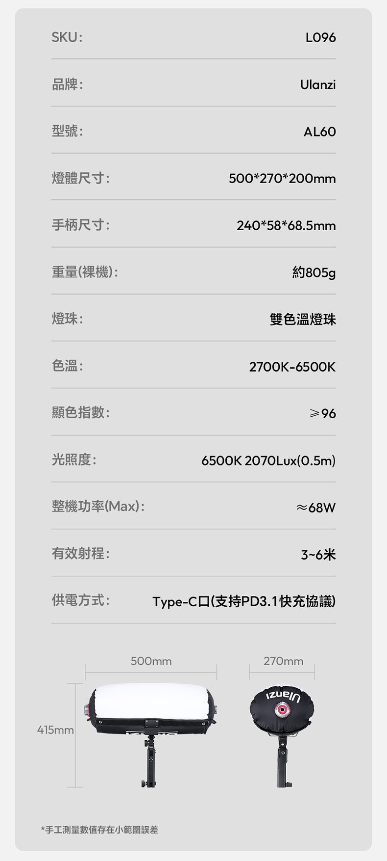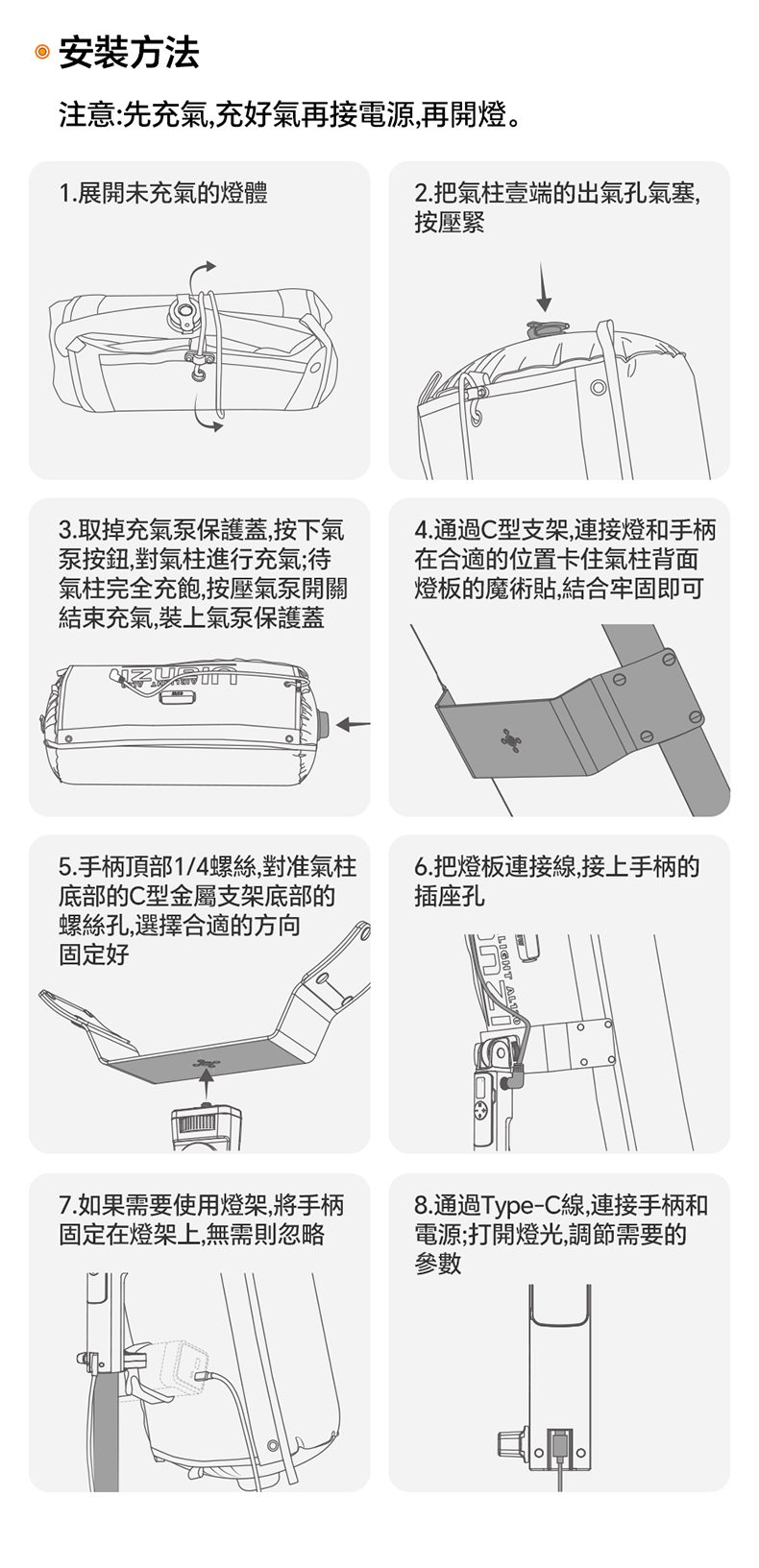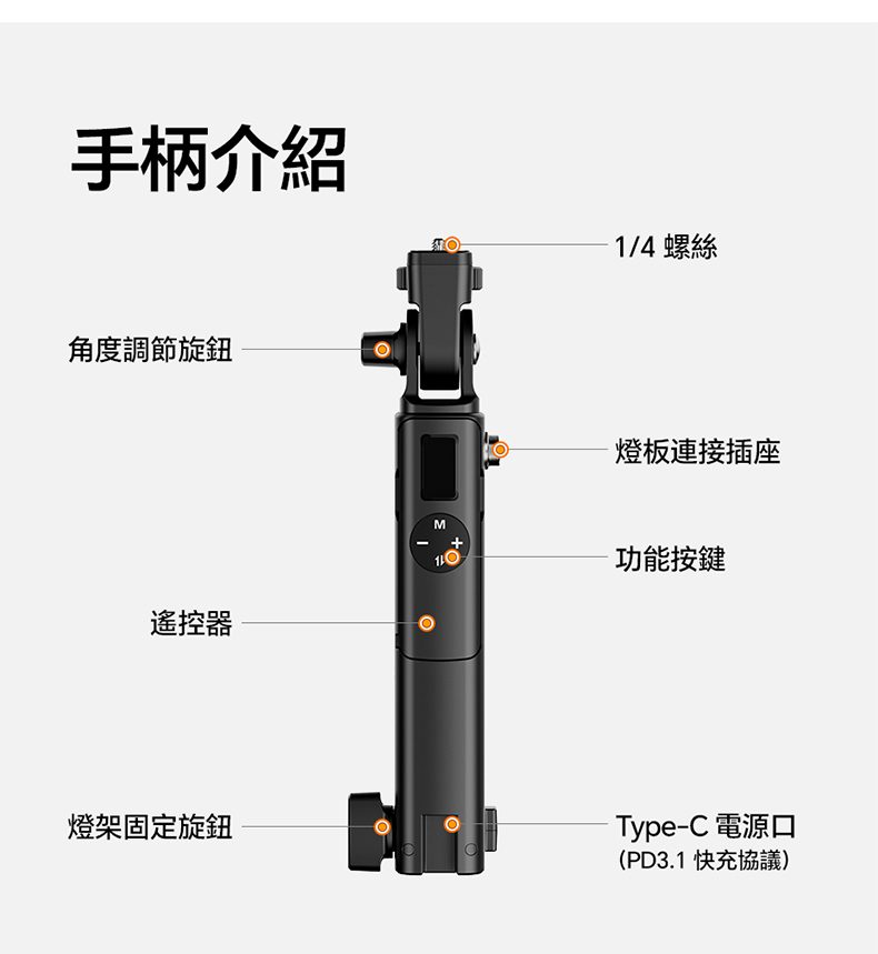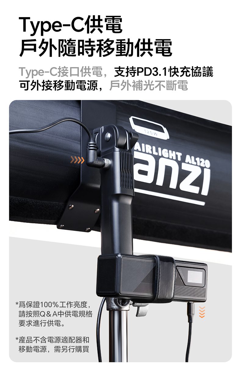 - Type-C 接口供電,支援 PD3.1 快充協議,可隨時連接行動電源,確保戶外持續補光。