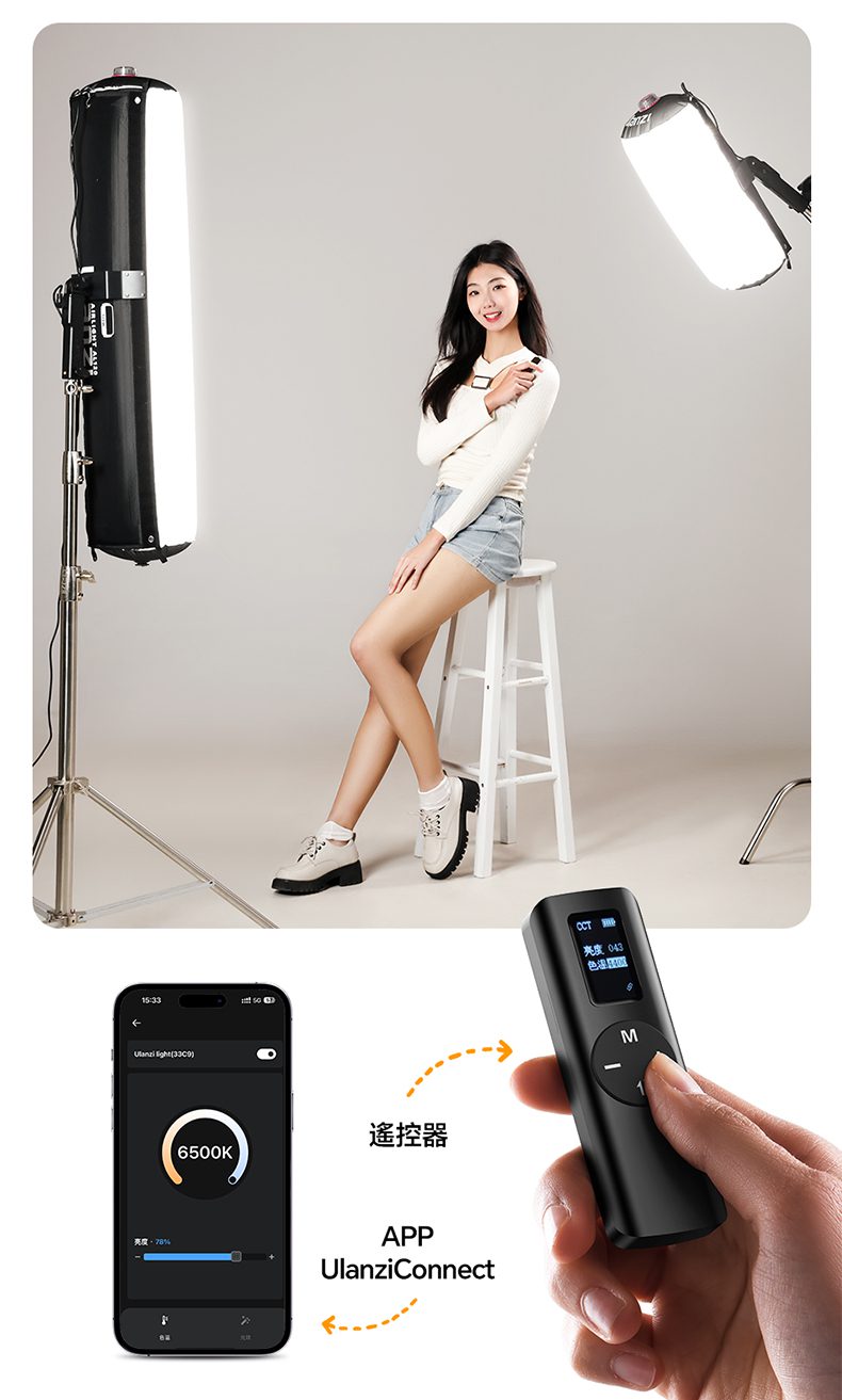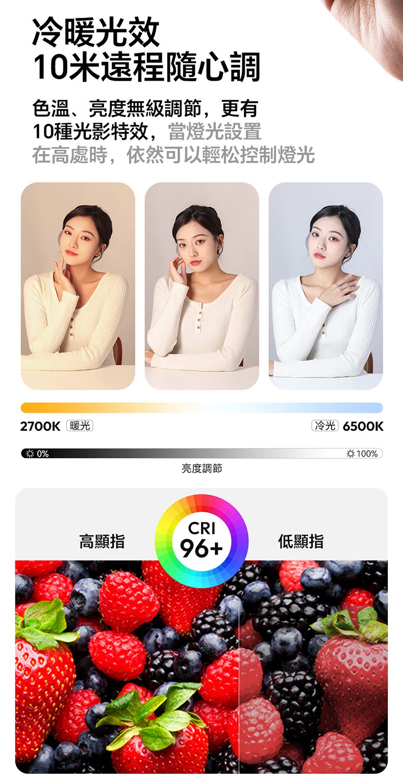 - 雙色溫調節(2700K 至 6500K),支援 10 種光效模式,可透過 APP 或遙控器遠程控制。