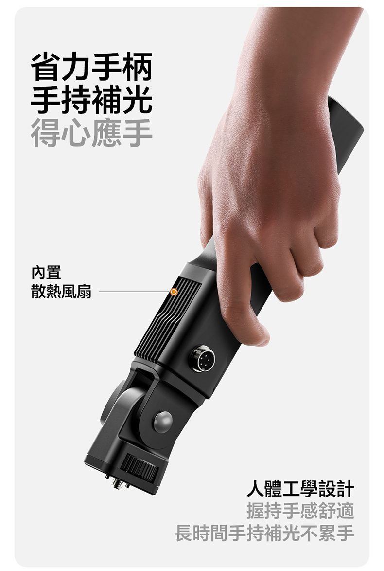 - 多功能布光方式,可實現手持、外接燈架、懸掛固定等多種佈光需求。