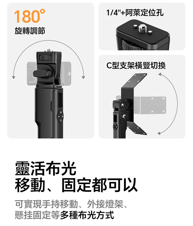 - 手柄設計符合人體工學,握感舒適,可旋轉角度達 180 度,適合手持或搭配 C 型支架使用。