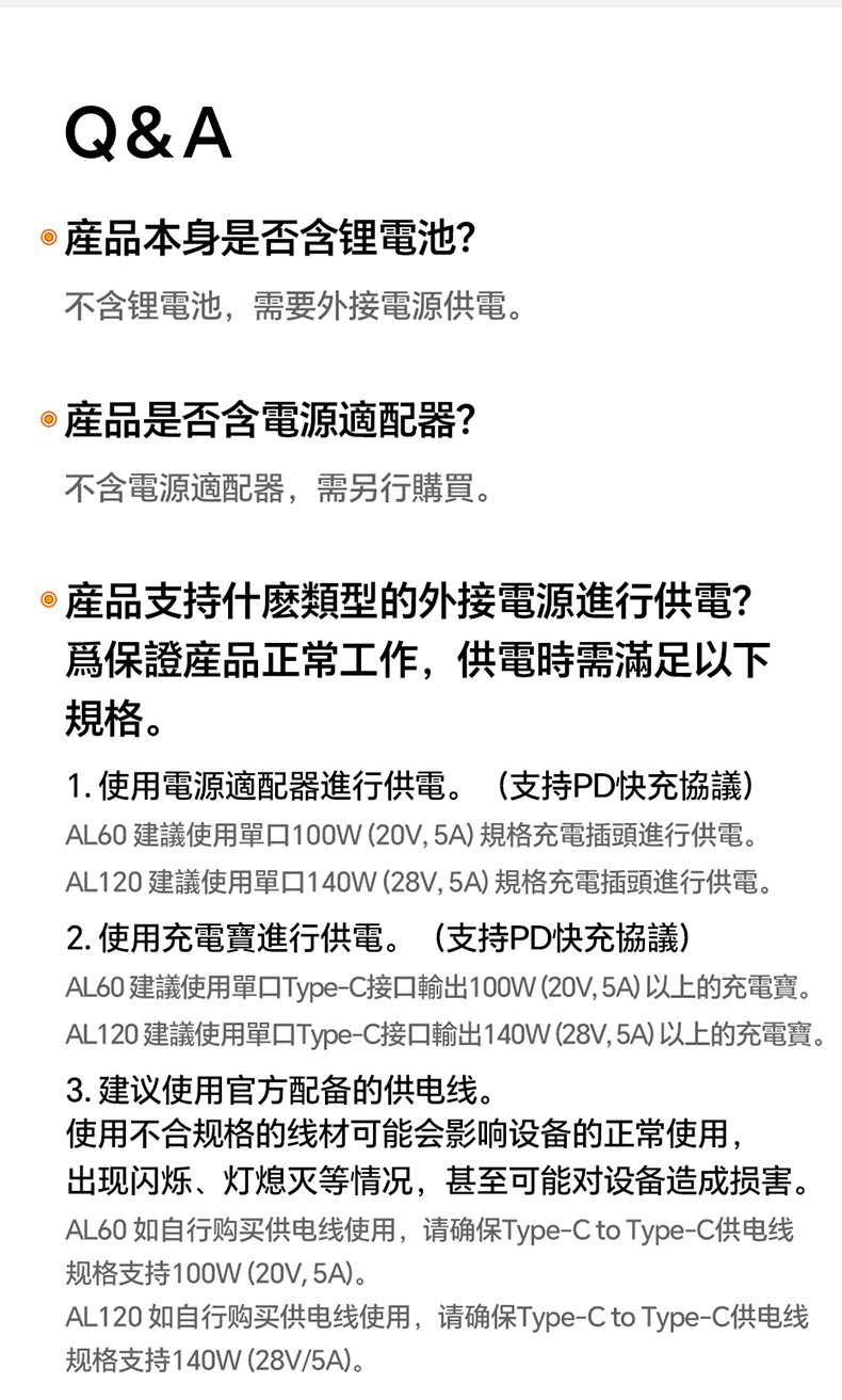 - 供電方式:Type-C口(支持PD3.1快充協議)