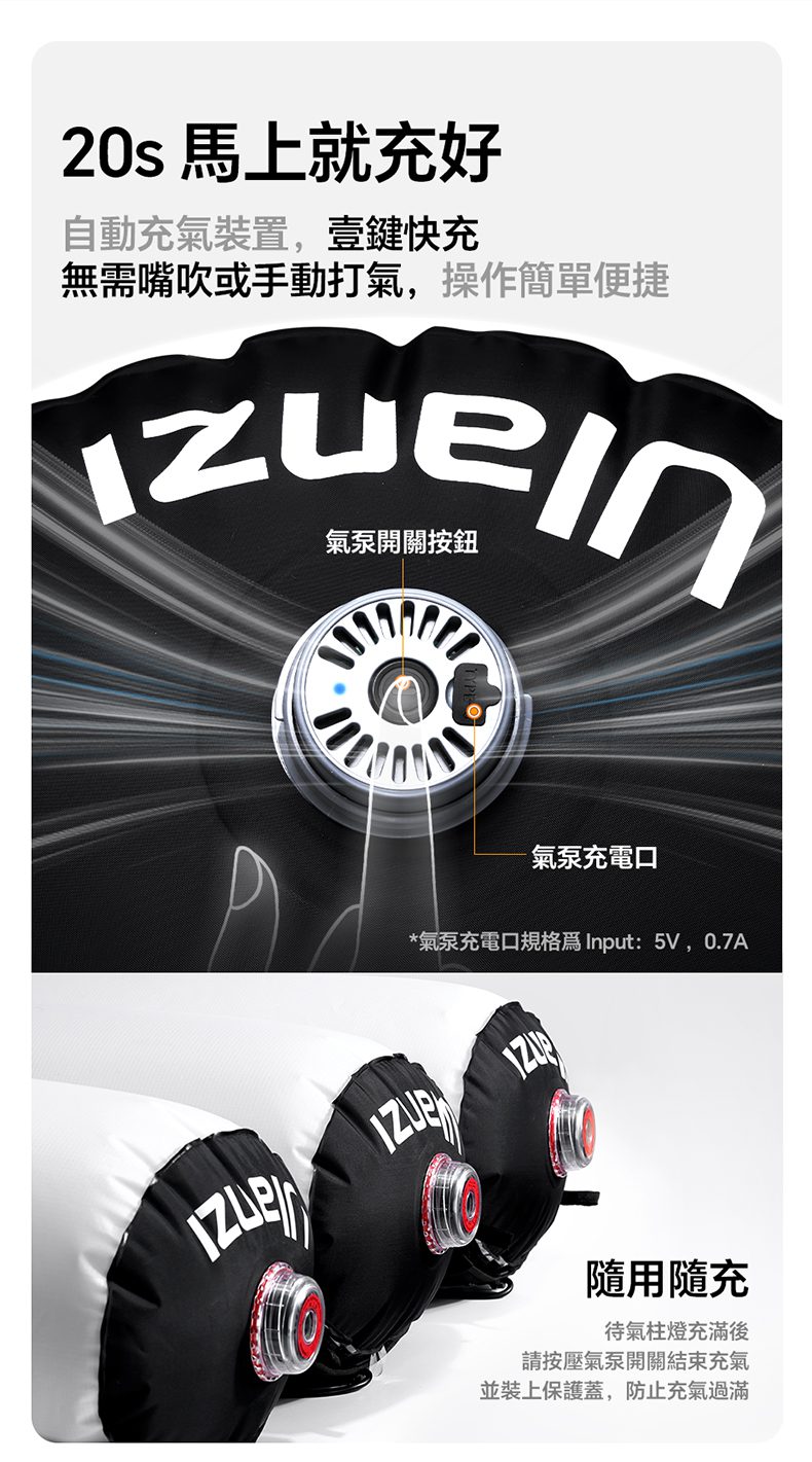 - 自動充氣裝置,20 秒快速充氣,操作簡單便捷。