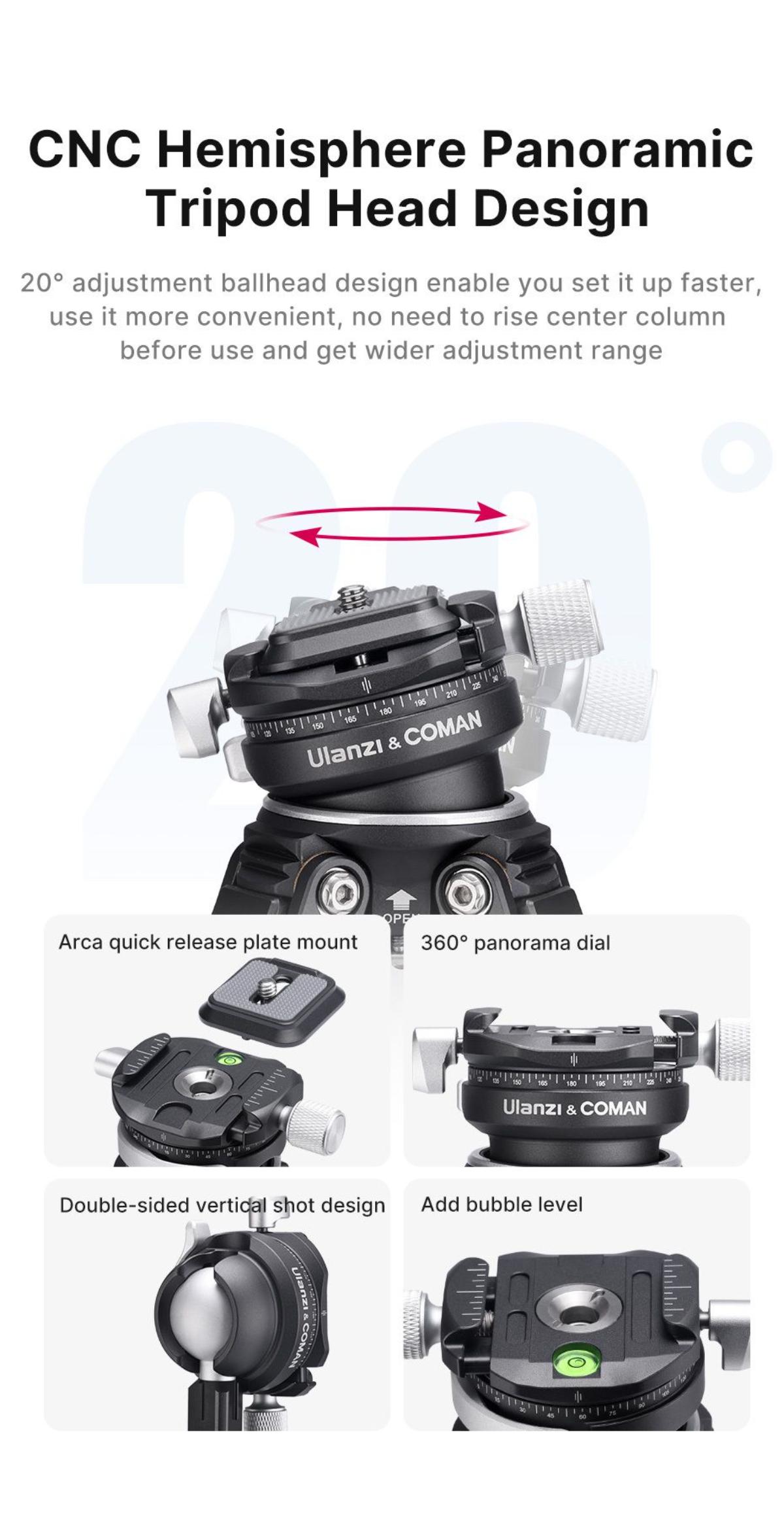 - 全新碗式雲台結構,提供360°全景刻度及雙開口豎拍設計,確保精準對焦與穩定性。
