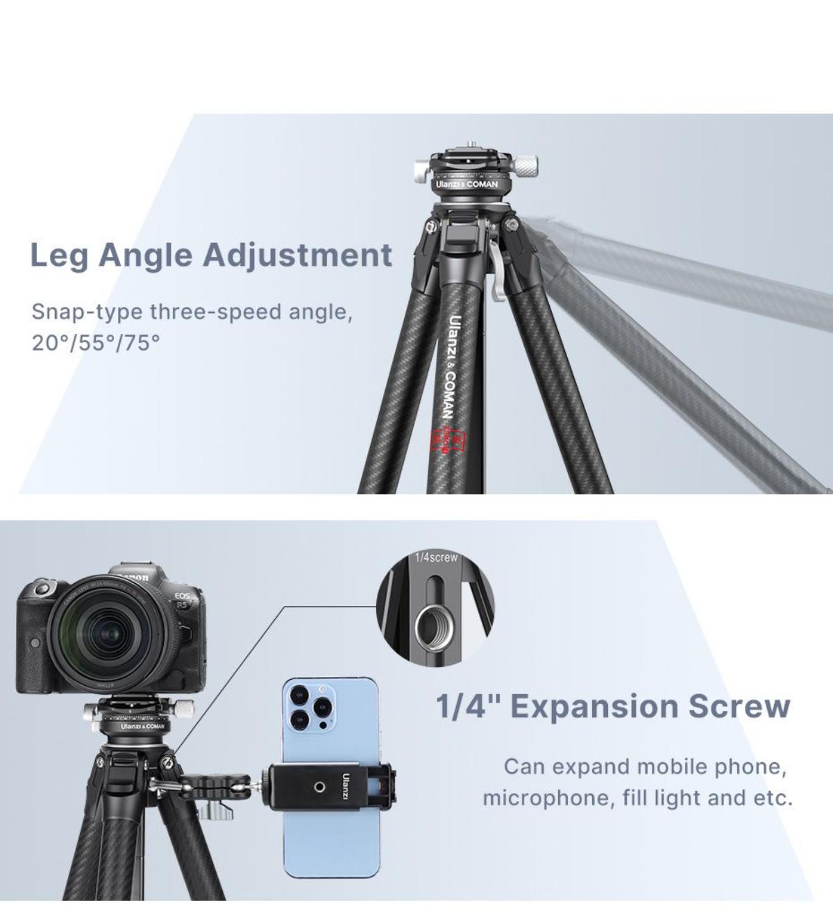 - 腳管可調節至20°、55°、75°三種角度,滿足不同拍攝需求。