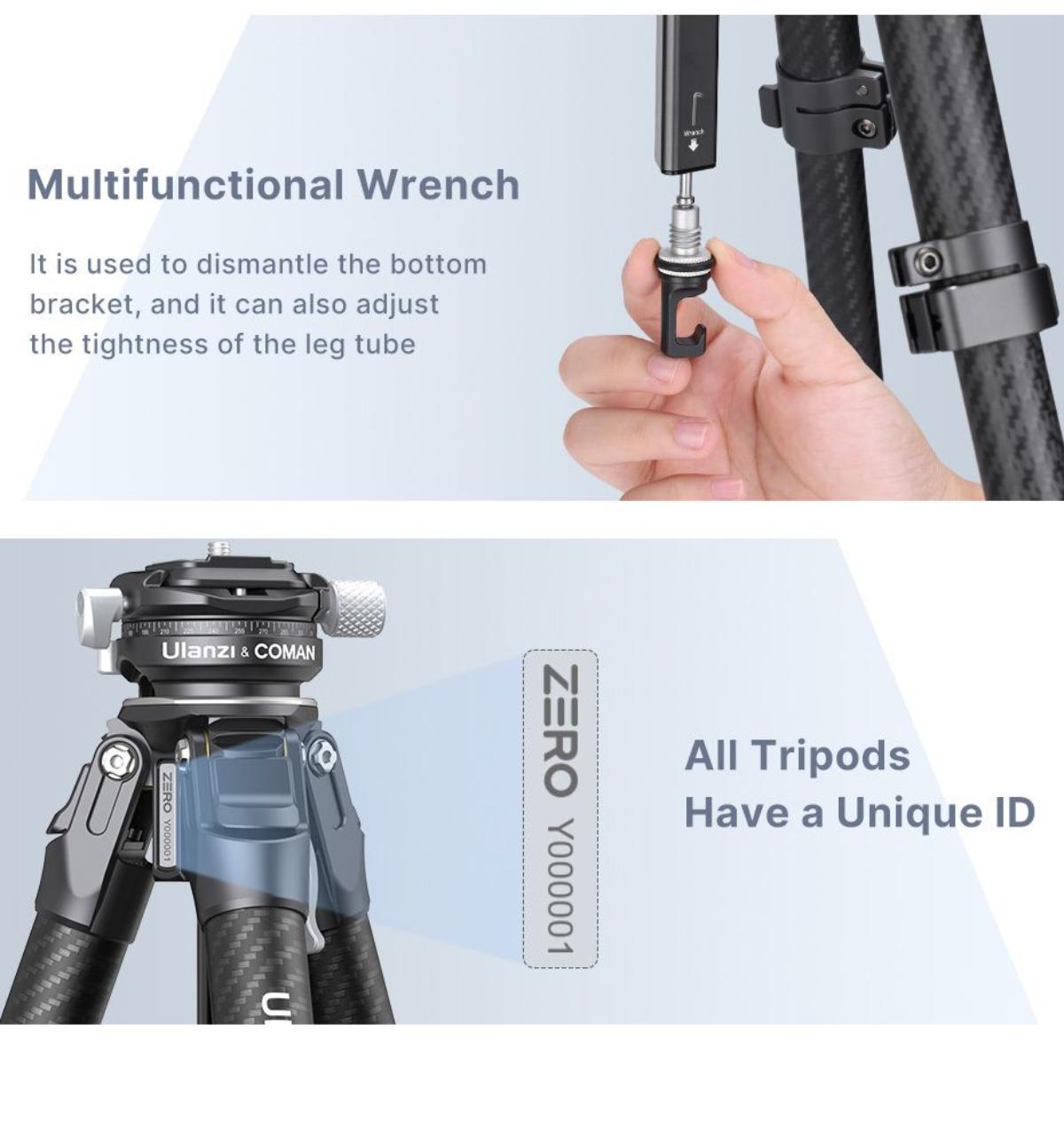 - 多功能扳手可快速調整腳管緊繃度,並具備拓展螺口,兼容手機、麥克風等設備。