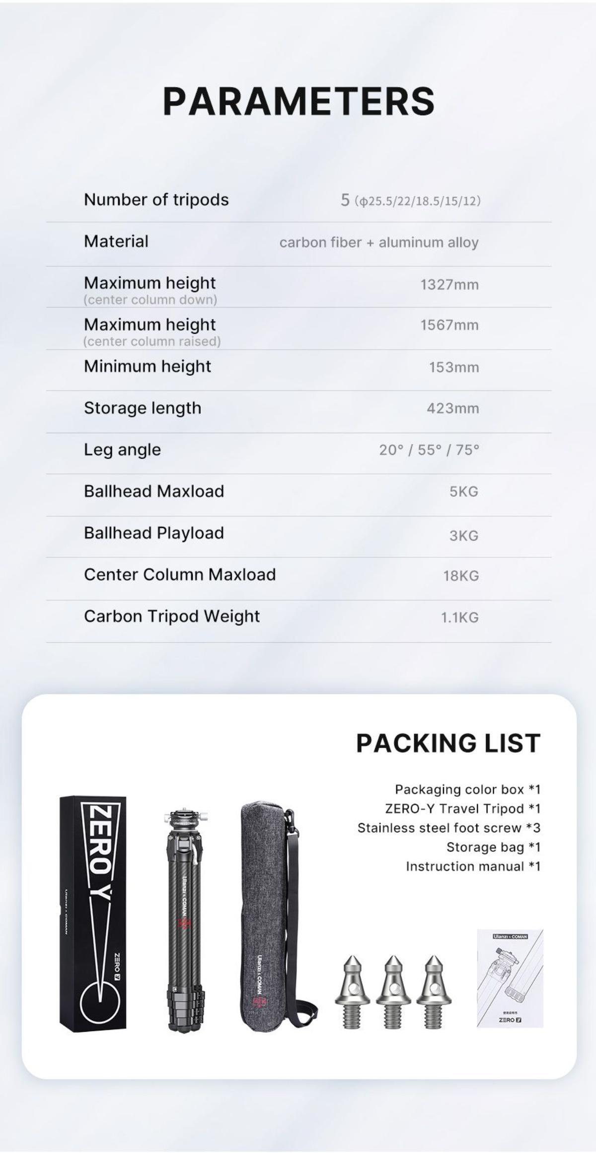 - 雲台承重:最大承重5KG/建議承重3KG(ZERO Y)