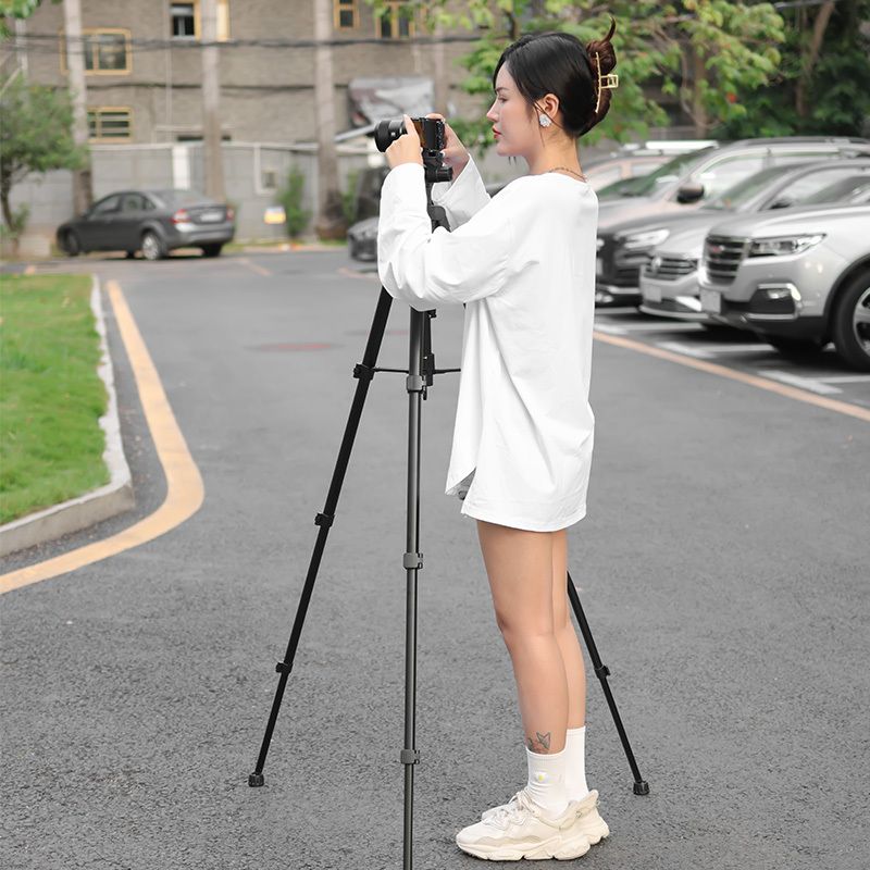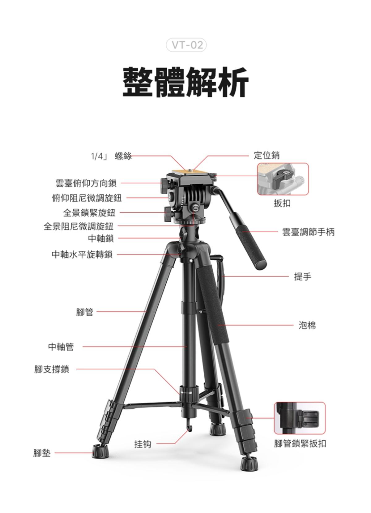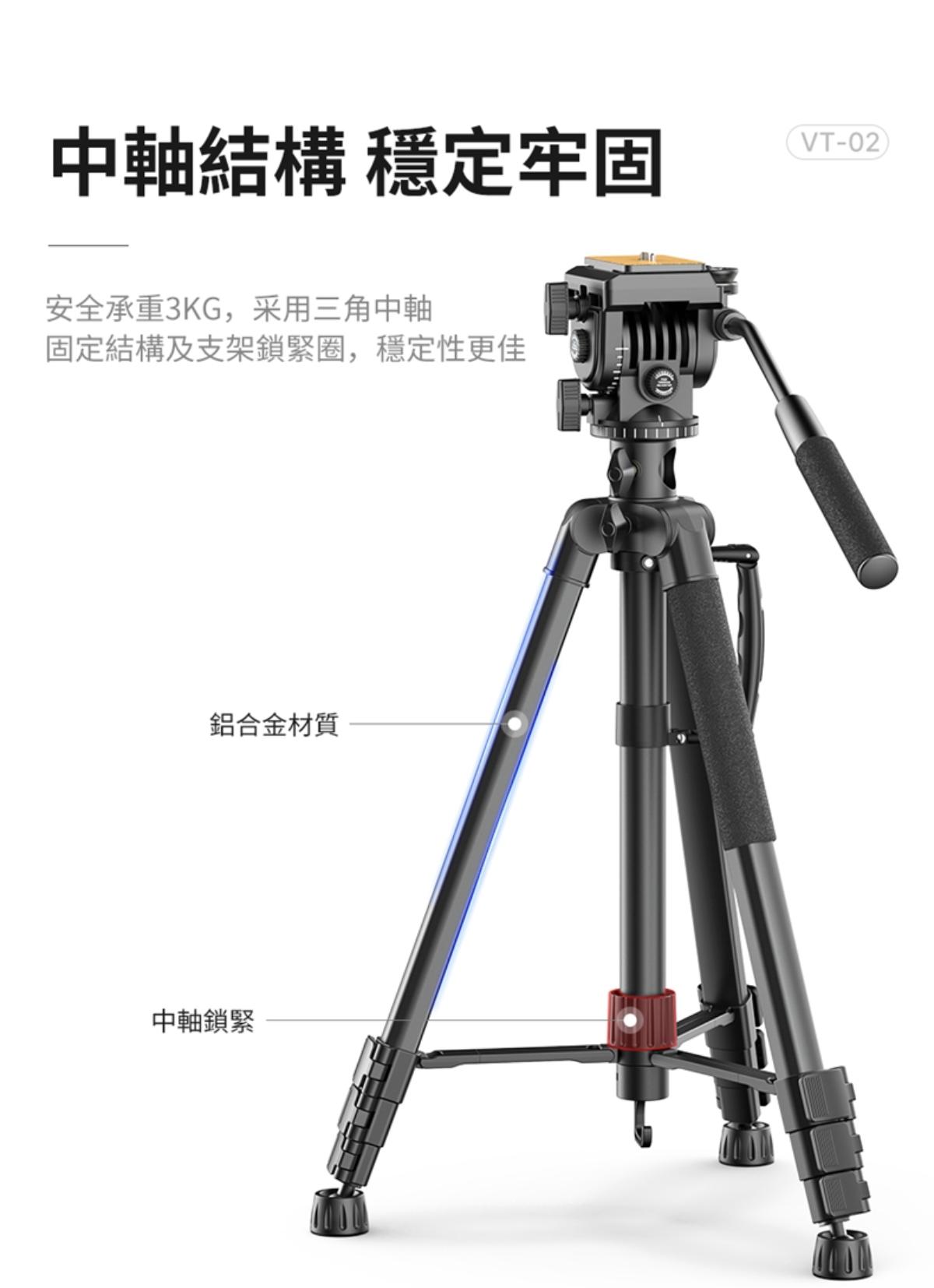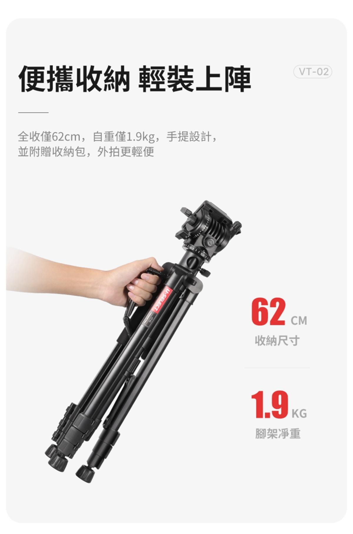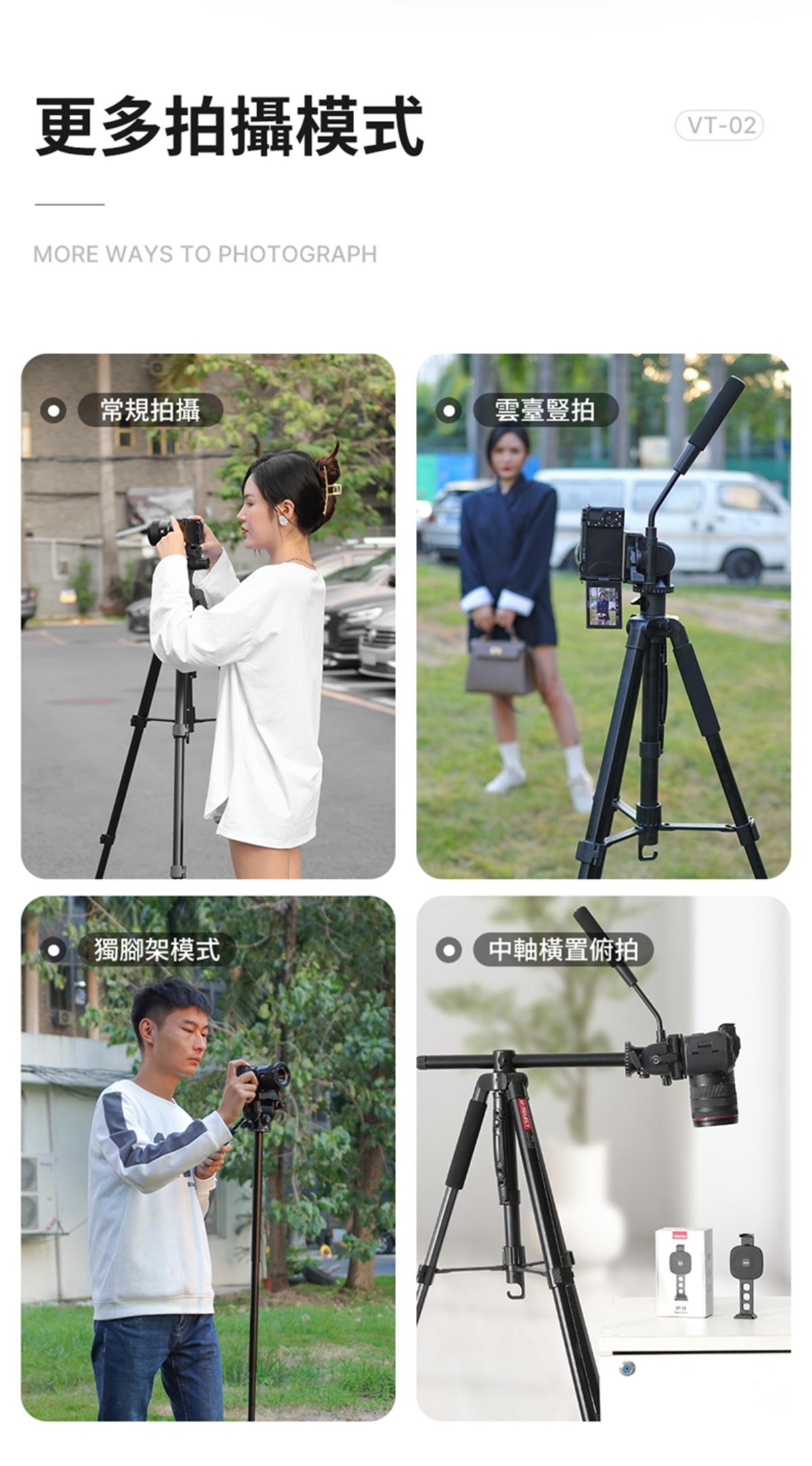 Ulanzi VT-02金屬中軸攝影三腳架,專為攝影愛好者打造。採用鋁合金材質,堅固耐用且僅重1.9KG,62CM折疊長度搭配手提設計,出行攜帶超便利。它擁有3KG強大承重能力,穩定性優異。五段腳管配合中軸橫置結構,高度在62CM到183CM間五檔自由切換,豎拍、俯拍輕鬆實現,還能秒變獨腳架。雲台俯仰與全景方向有獨立鎖定旋鈕及阻尼微調,360°全景拍攝順暢。贈送手機夾,支援單眼與手機雙機位,是記錄生活、創作大片的得力助手 。