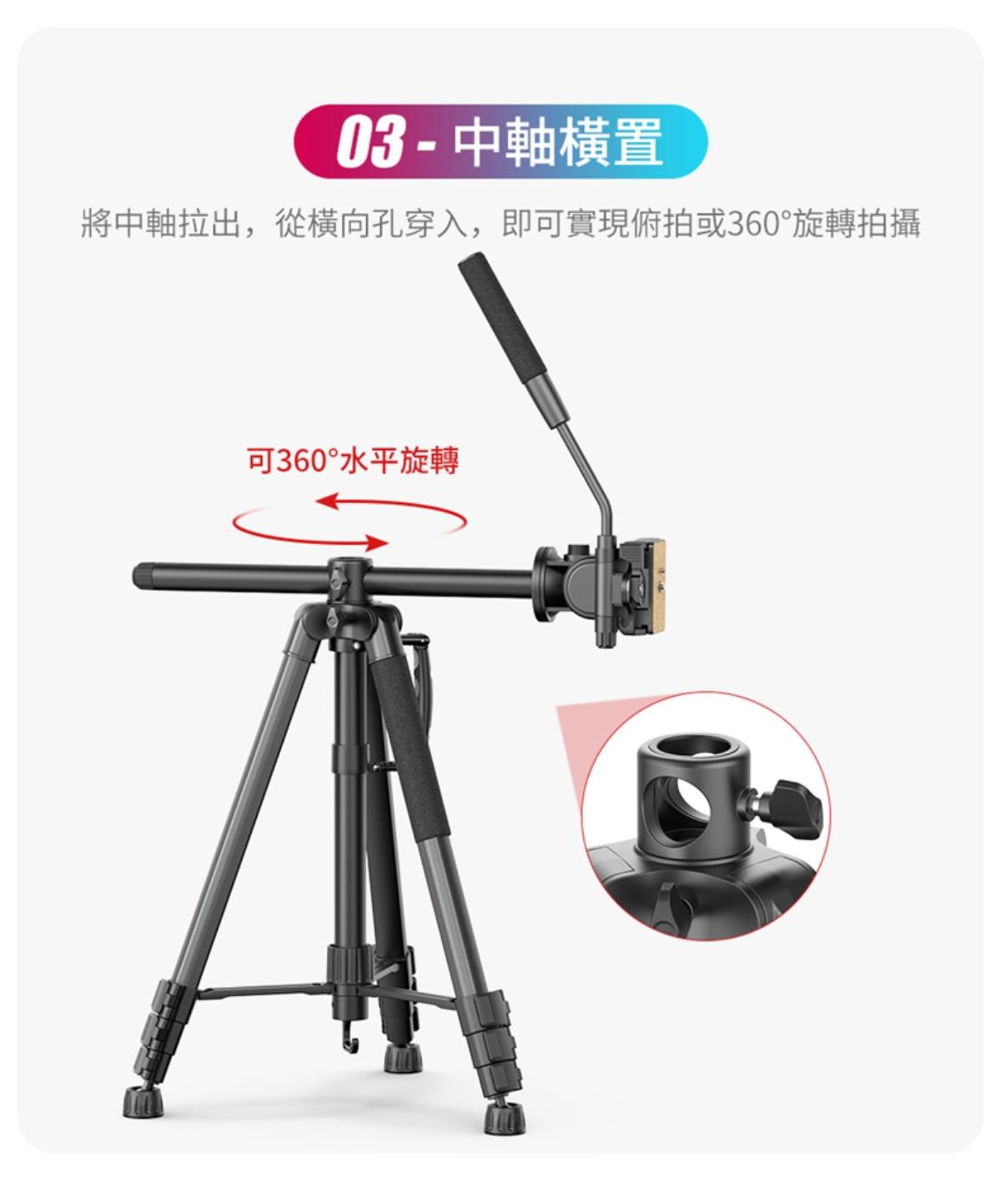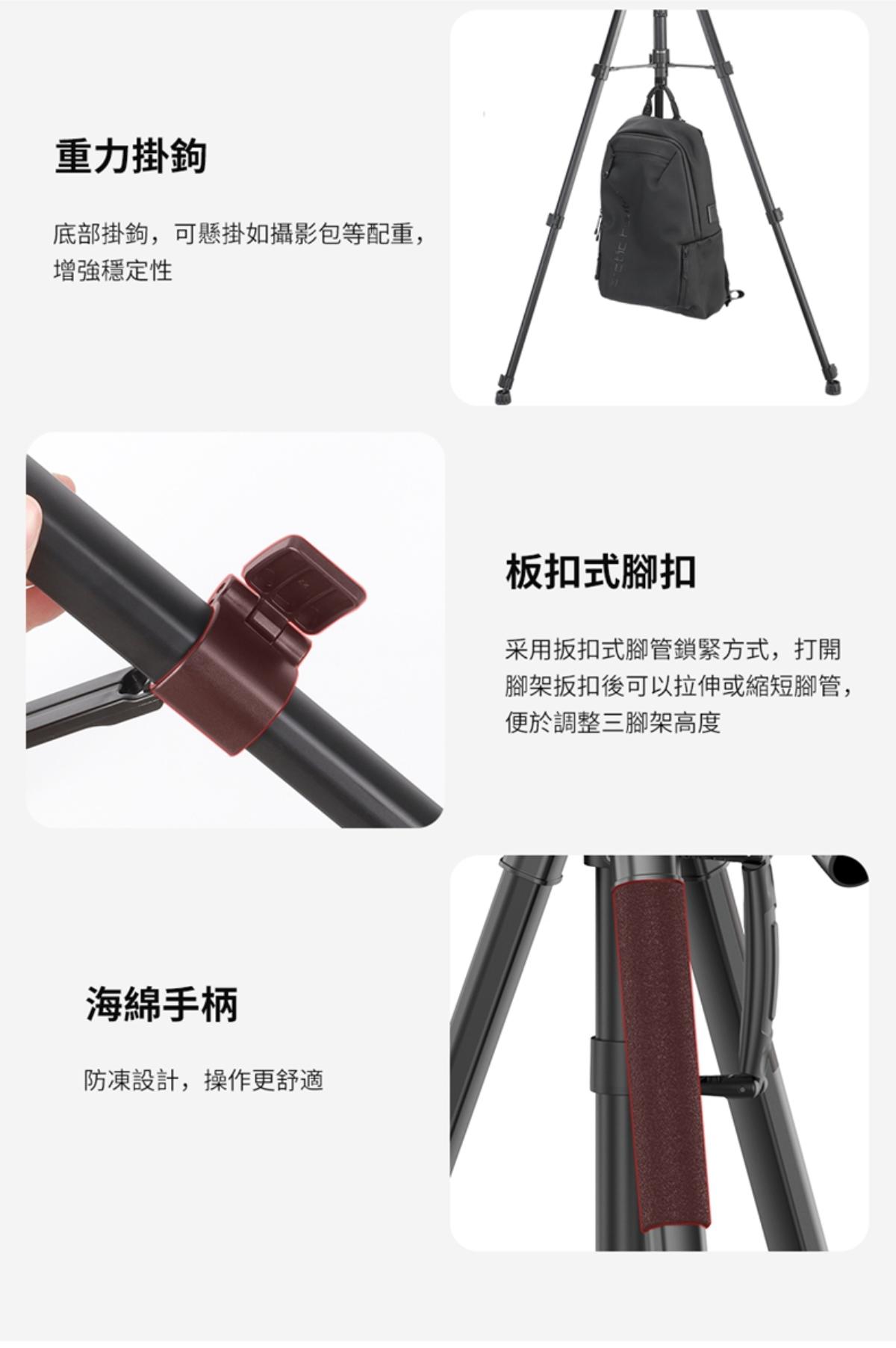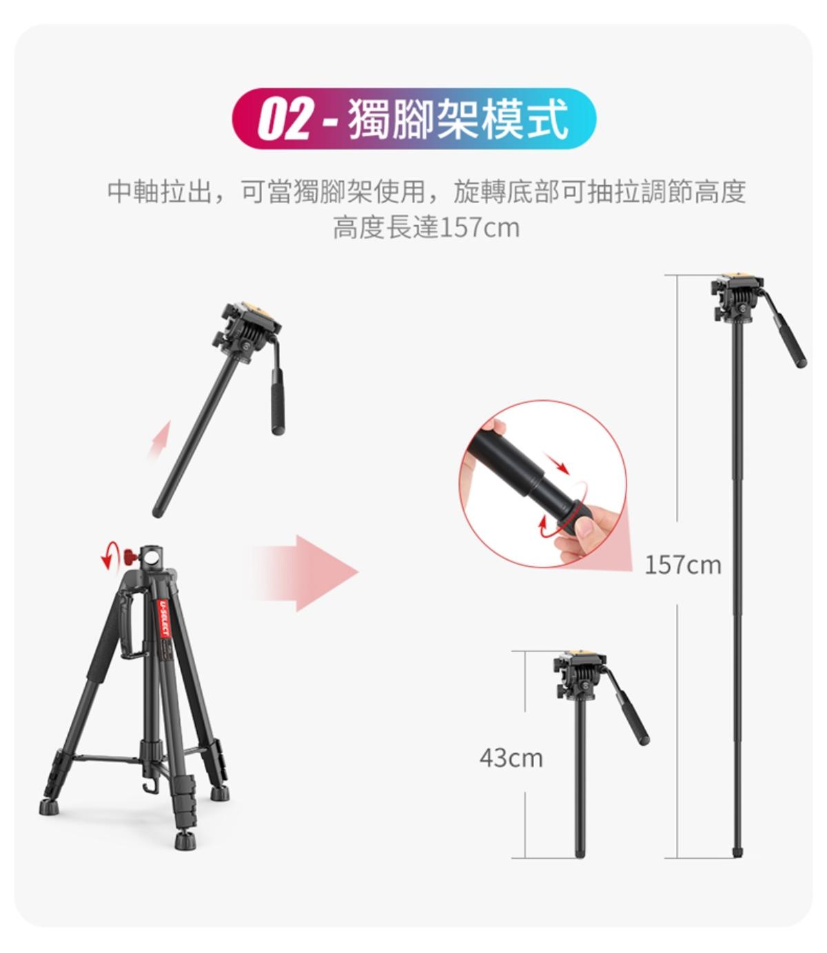 - 獨腳架模式,中軸拉出後可作為獨腳架使用,高度可達157公分