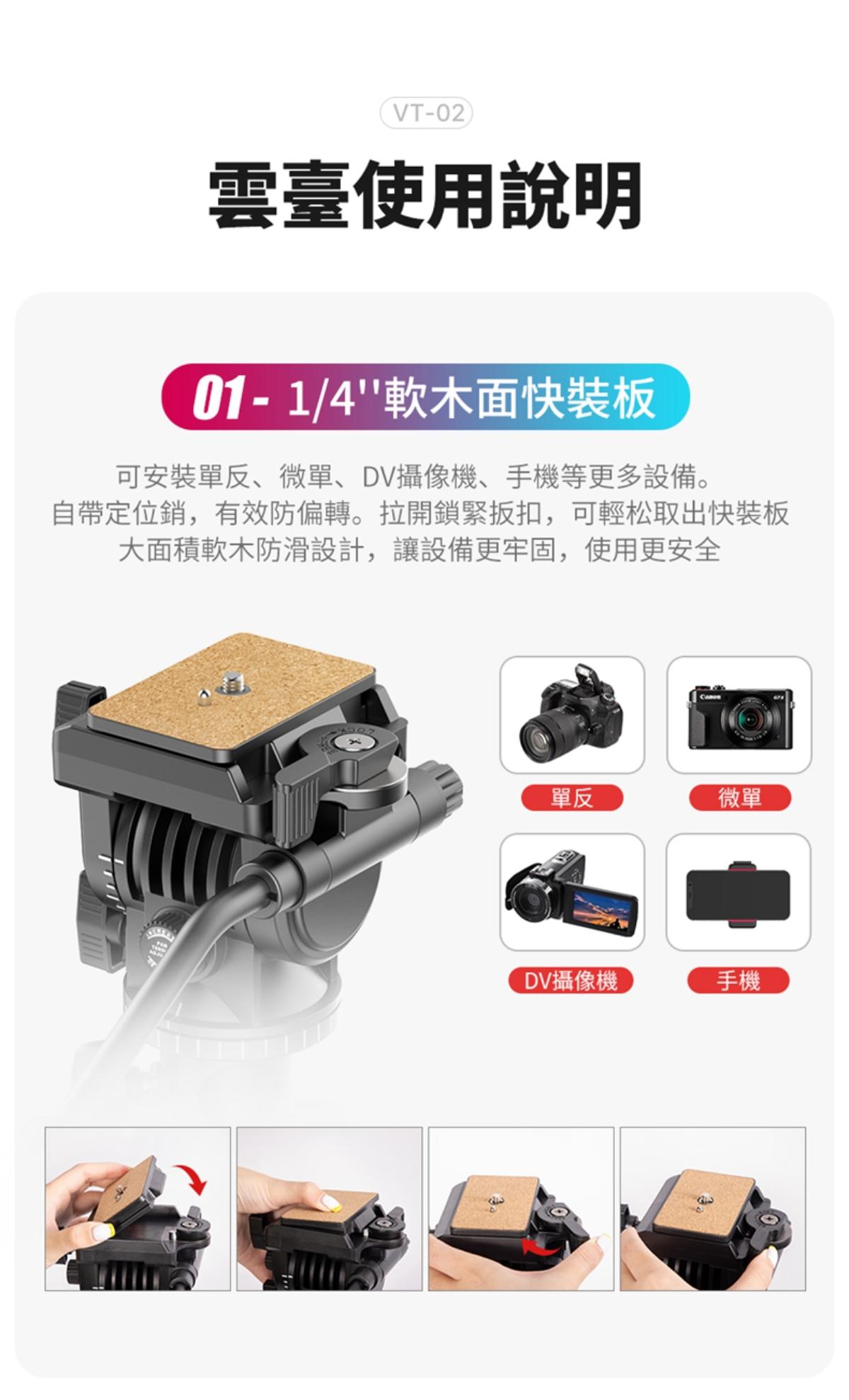 - 雲臺配有1/4英寸硅膠面快裝板,適用於單反、微單、DV攝像機和手機等設備