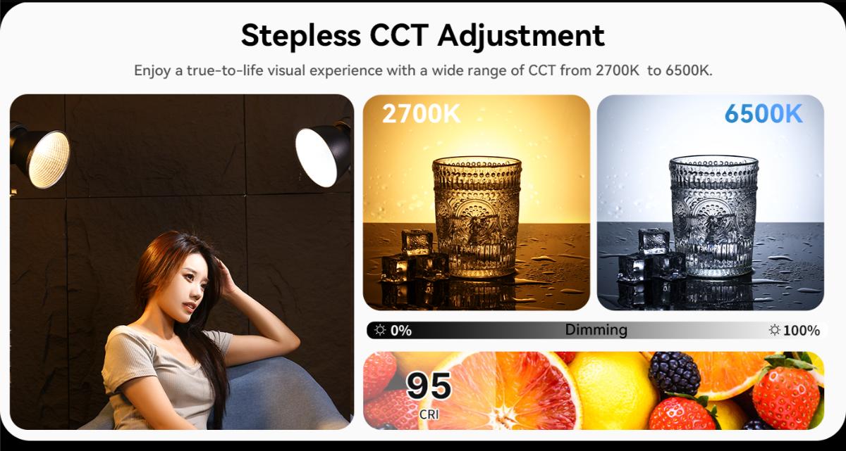 - 支援廣域雙色溫(2700K-6500K),顯色指數超過95,還原真實色彩。