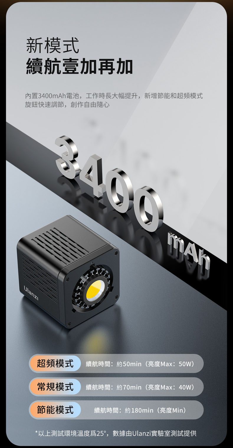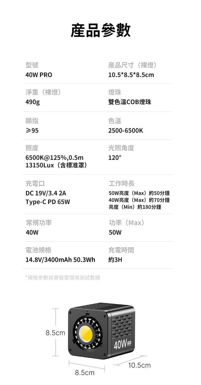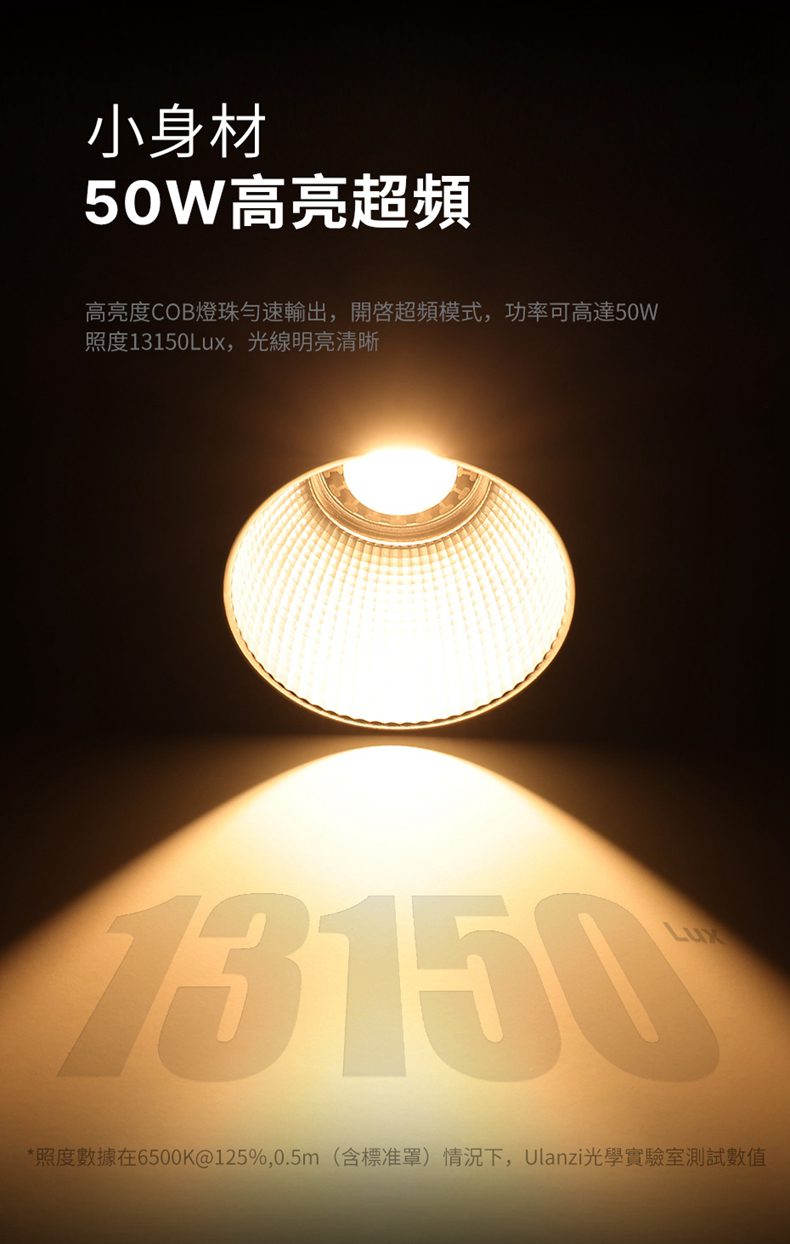 - 高功率輸出:開啟超頻模式後功率可達 50W,照度高達 13150Lux,能提供充足且強烈的光線,滿足對高亮度補光有需求的專業場景。