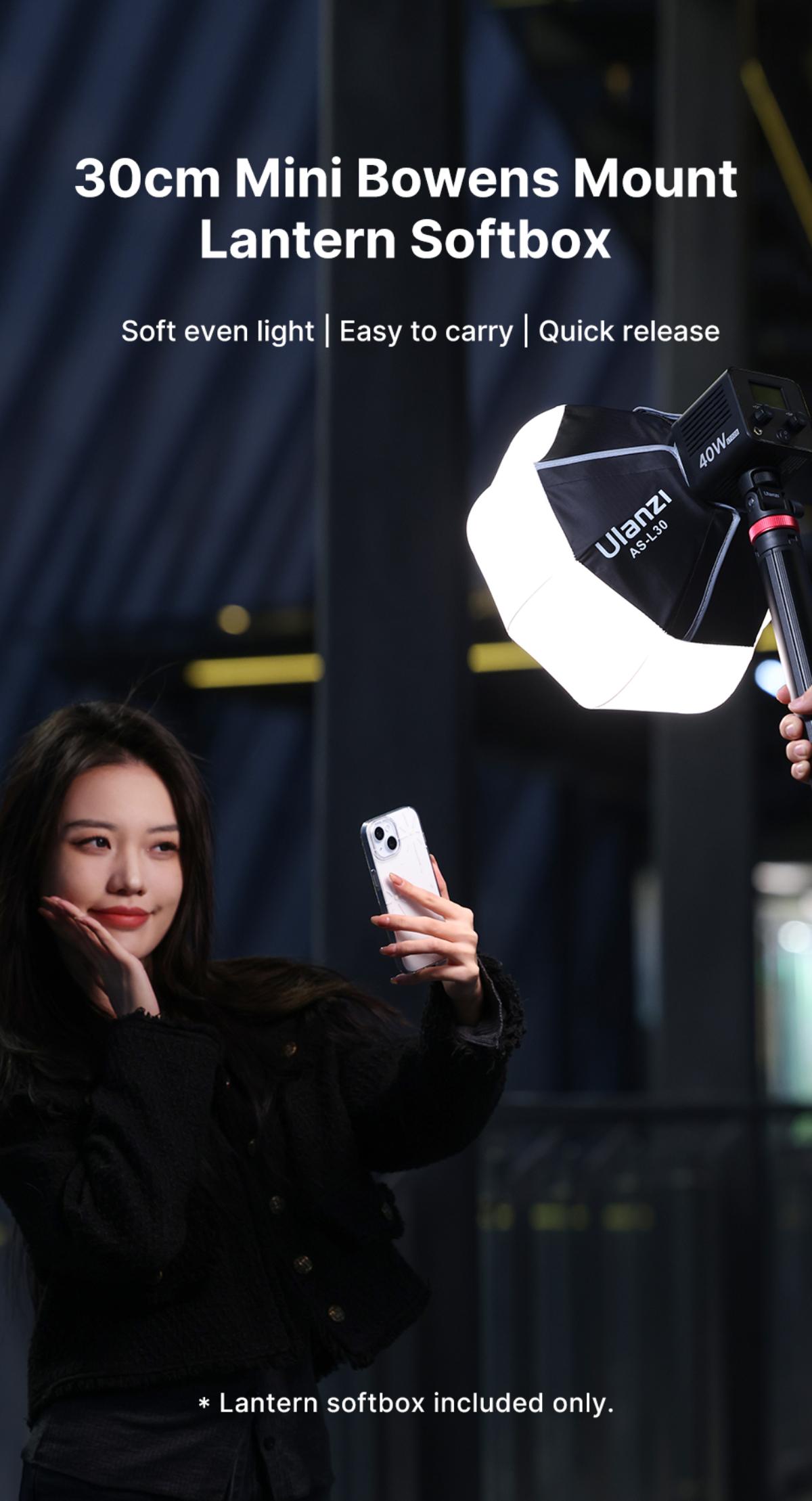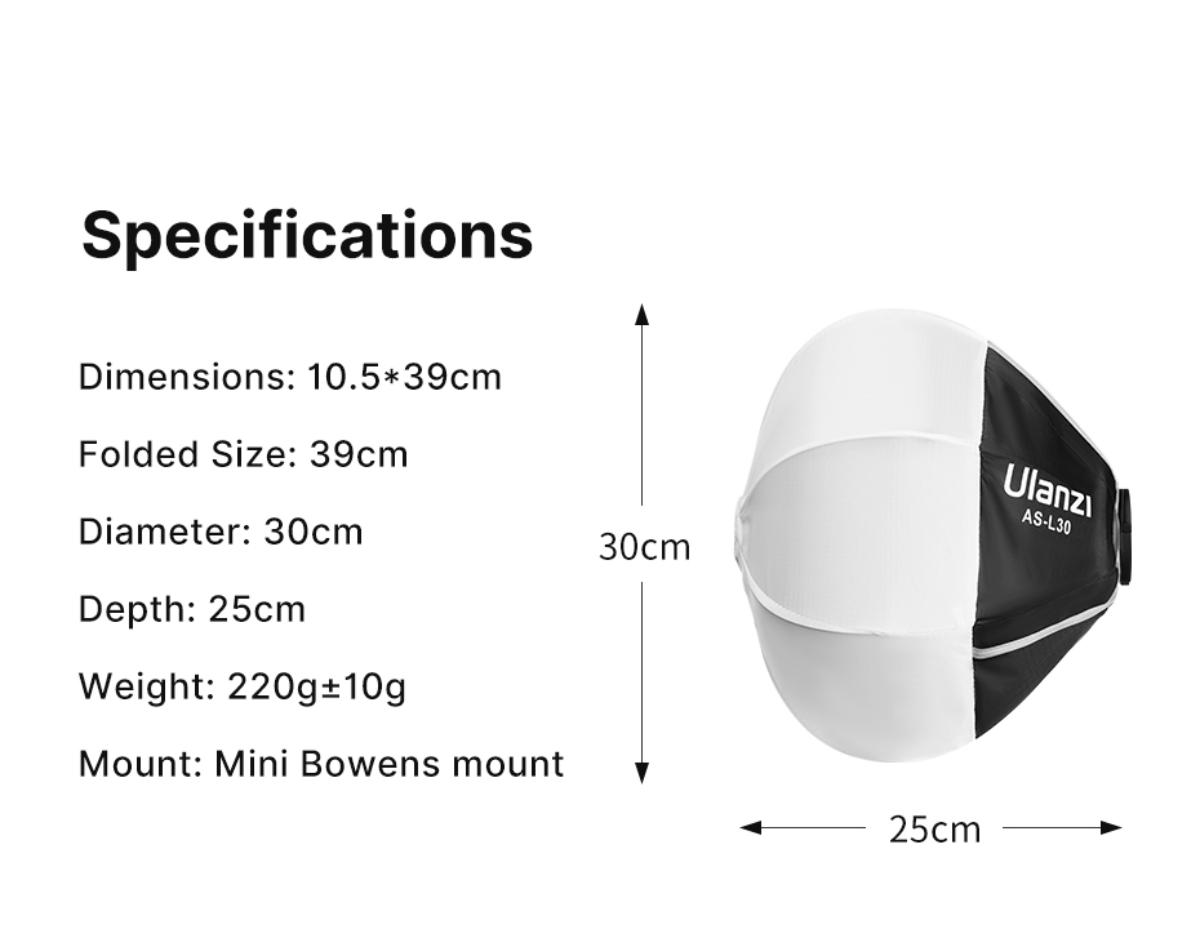 Ulanzi AS-L30 柔光球是一款專為攝影愛好者設計的便攜式補光工具,適用於各種小型補光燈。其直徑達30cm,採用球型設計,出光範圍廣闊,光效細膩柔和,能有效減少陰影,提升影像品質。產品重量僅約220克,體積輕巧,方便攜帶,適合外出拍攝使用。 柔光球採用高密度反光面料和十字柔光布,確保光線均勻散發,呈現自然柔和的效果。安裝與拆卸過程簡單易行,只需雙手按壓卡盤即可完成操作,節省時間且操作便捷。此外,產品還配備了專用收納袋,方便整理與存放。 Ulanzi AS-L30 柔光球不僅適合個人自拍、直播等場景,也能滿足專業攝影師的需求,是追求高品質光影效果的理想選擇。