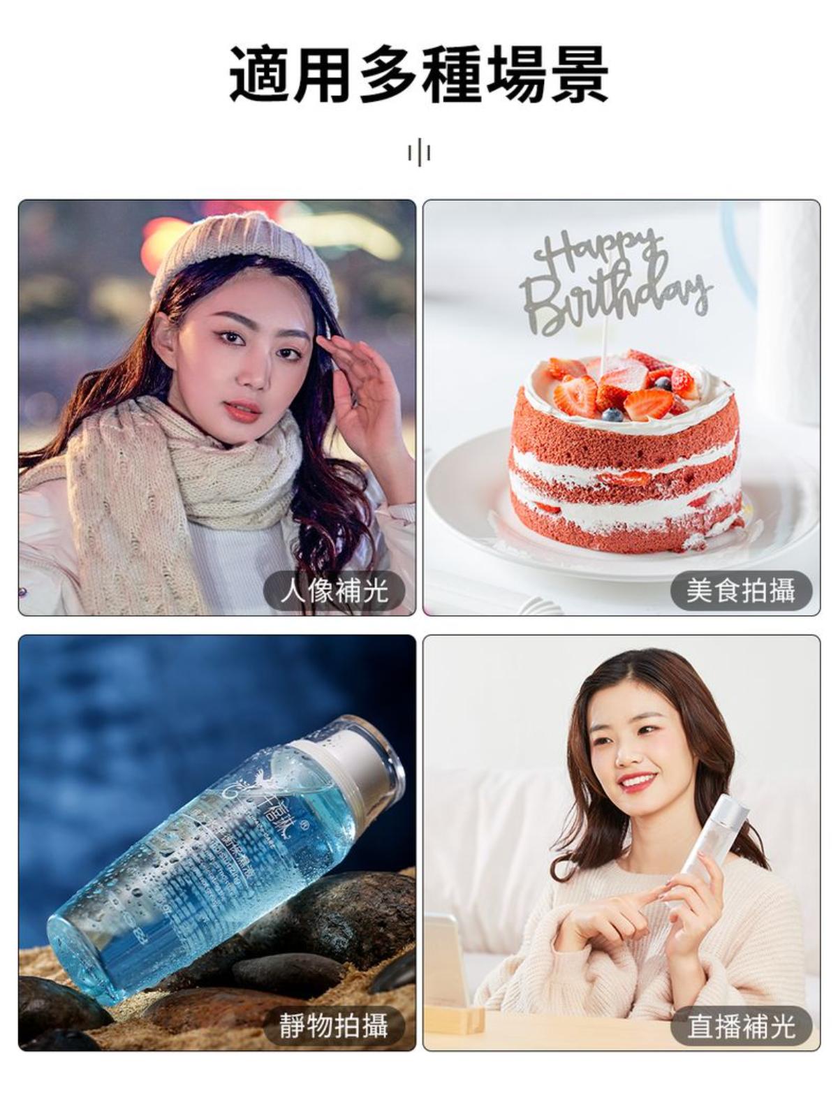 - 適用於人像補光、美食拍攝、靜物攝影及直播等多種場景