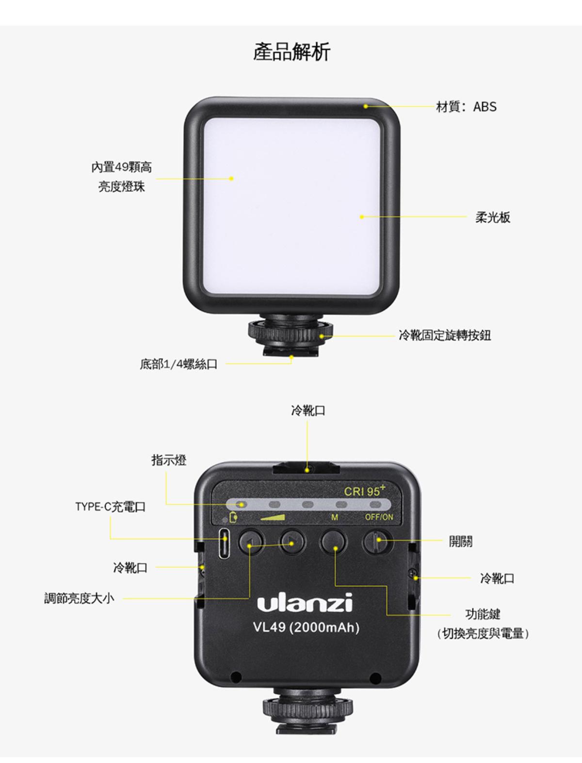 - 多個冷靴口設計,兼容市面上帶熱靴口的相機和三腳架,支持多燈拼接