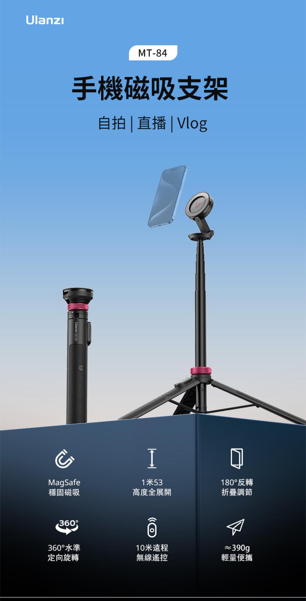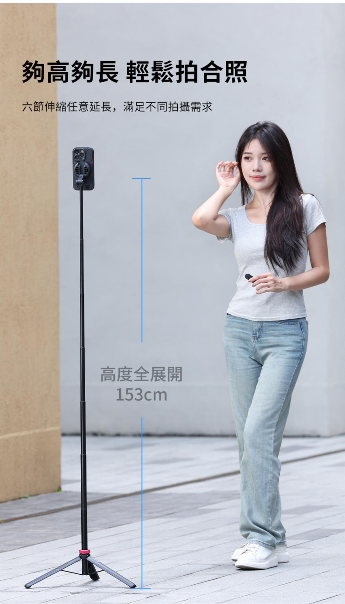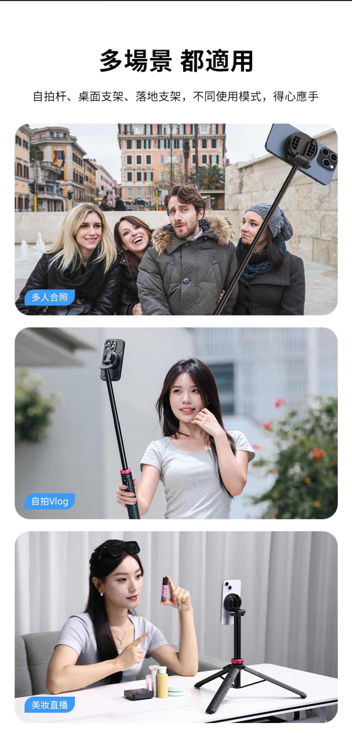 - 多種使用模式:自拍杆、桌面支架、落地支架