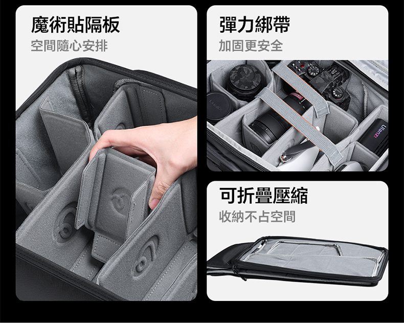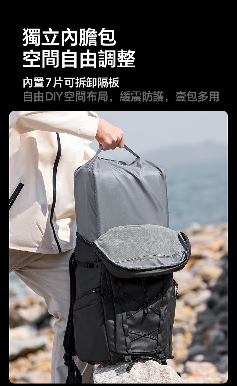 - 分離式內搭包,空間自由調整:內附 7 片可拆卸隔板,空間自由 DIY,緩震防護,一包多用,滿足您不同的收納需求。
