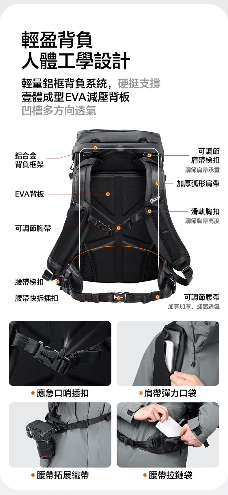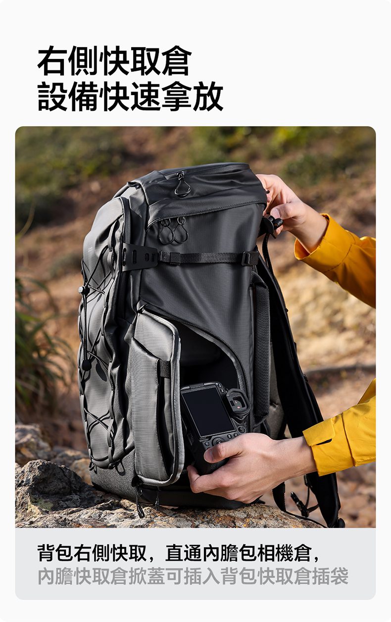 - 右側快取包,隨時取用設備:背包右側快取,直通內搭相機包,隨時取用所需設備,不錯過任何精彩瞬間。