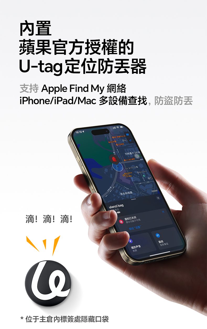 - 內建 Apple 官方授權 U-tag 定位器:支援 Apple Find My 網路,iPhone/iPad/Mac 多設備查詢,防盜防丟,讓您安心出行。