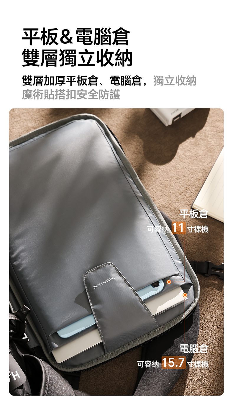 - 平板&筆電夾層,雙層獨立收納:雙層加厚平板、筆電夾層,獨立收納、安全防護 (可容納 11 吋平板、15.7 吋筆電)。