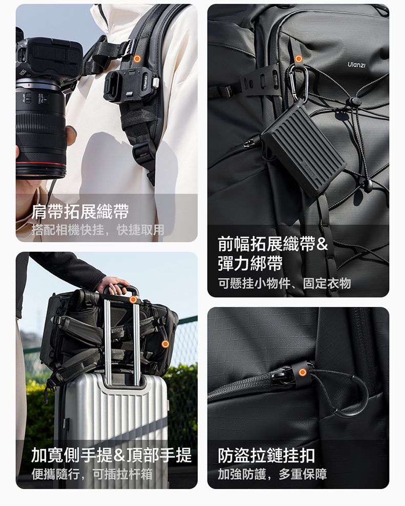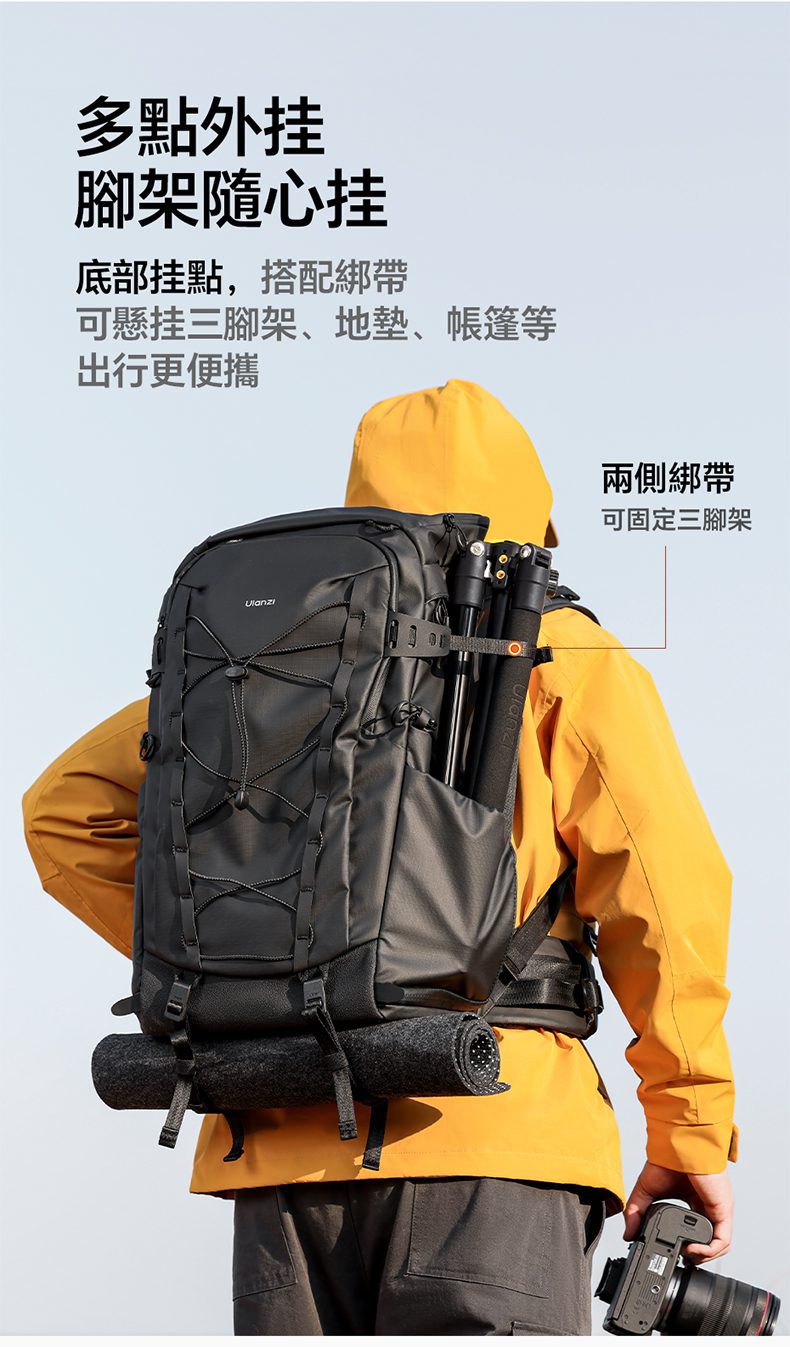 - 多點吊掛,設備輕鬆帶:底部吊掛,搭配綁帶,可懸掛三腳架、地墊、帳篷…等,攜帶更輕鬆。