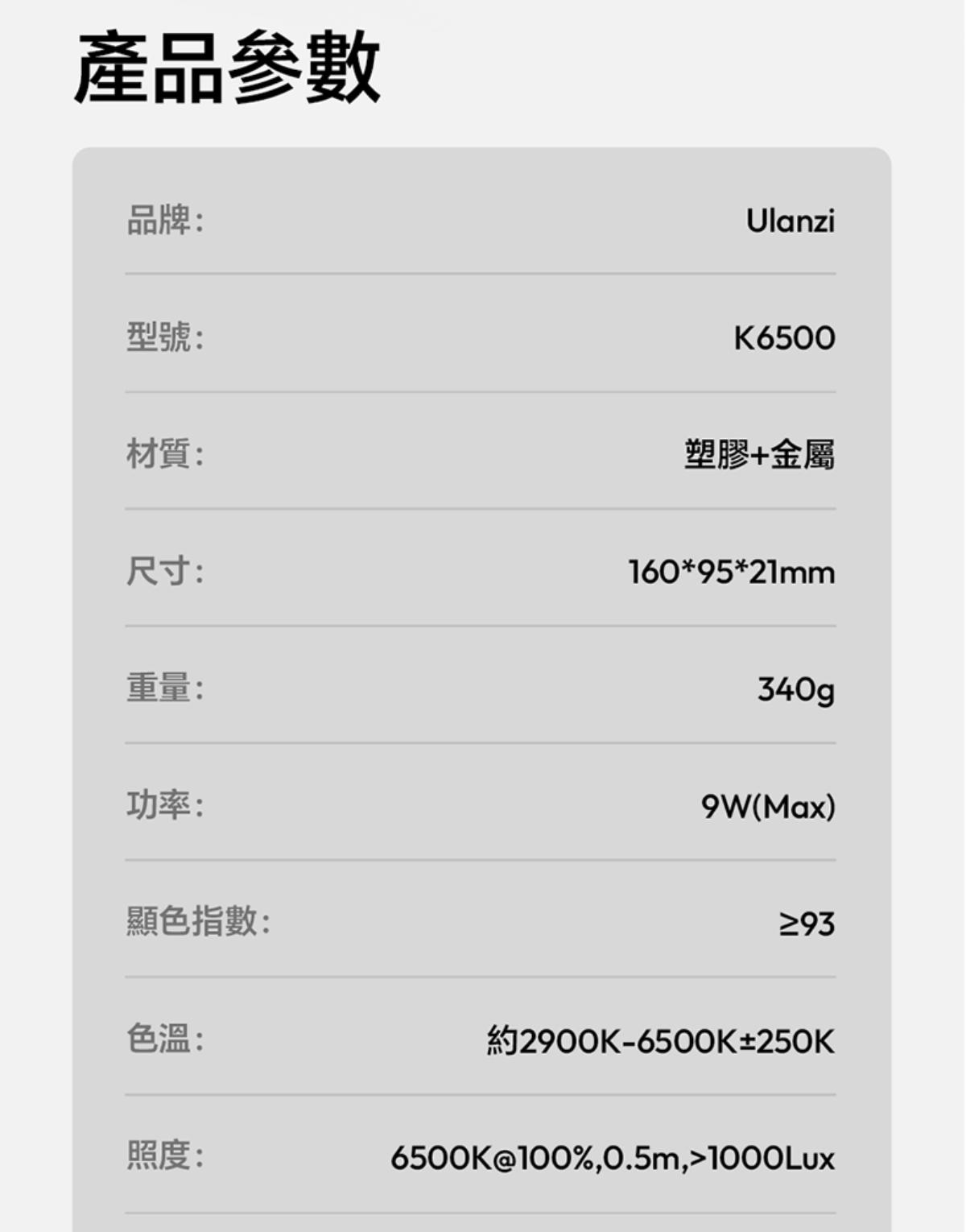 - 照度:6500K@100%,0.5米,>1000Lux