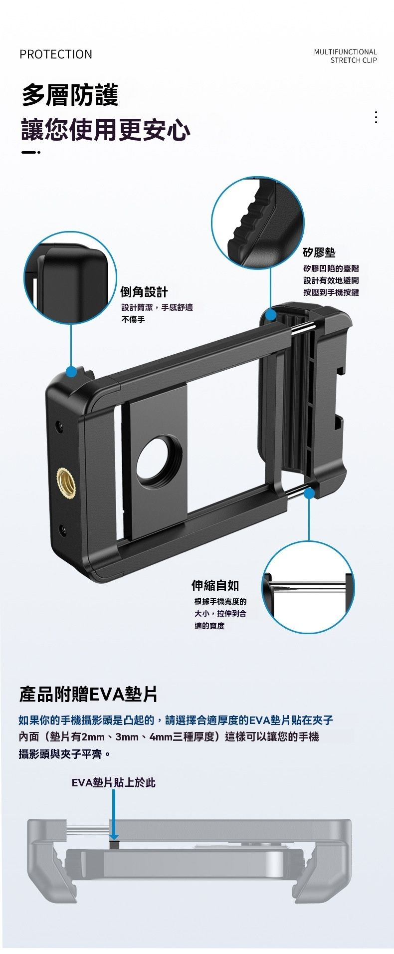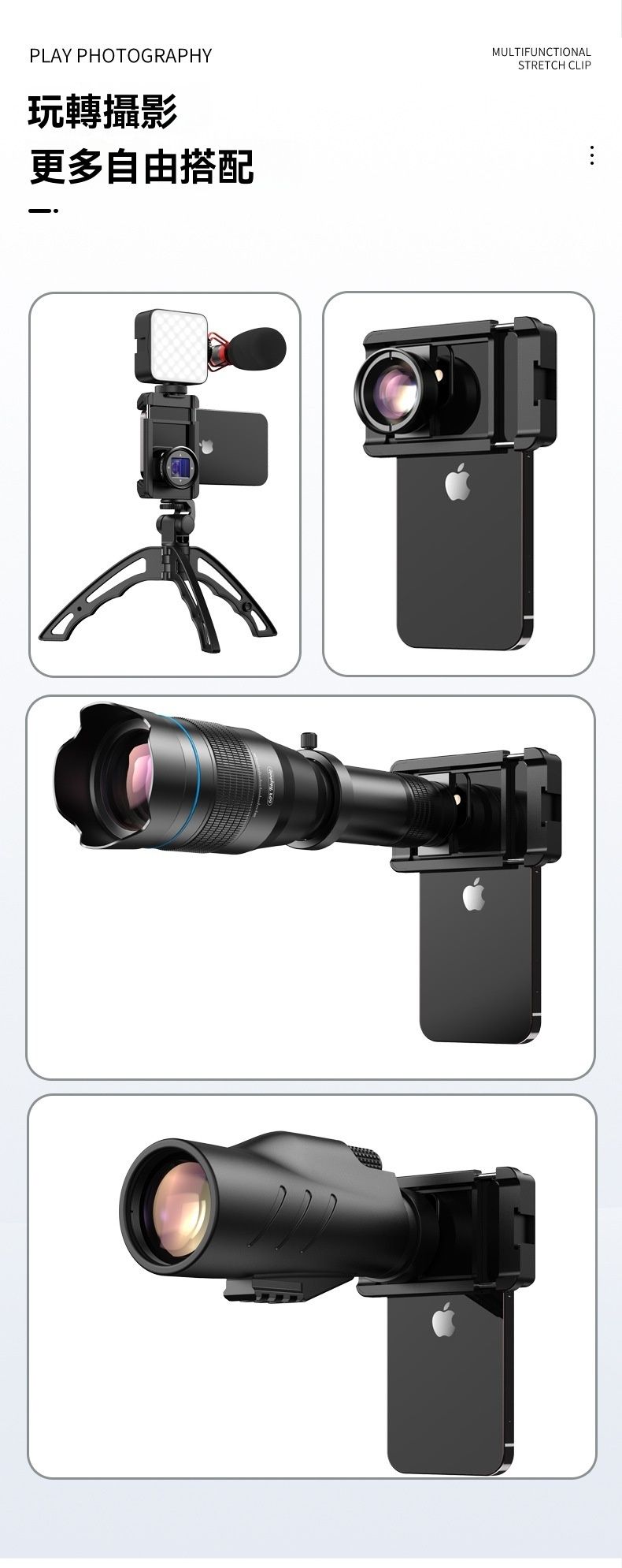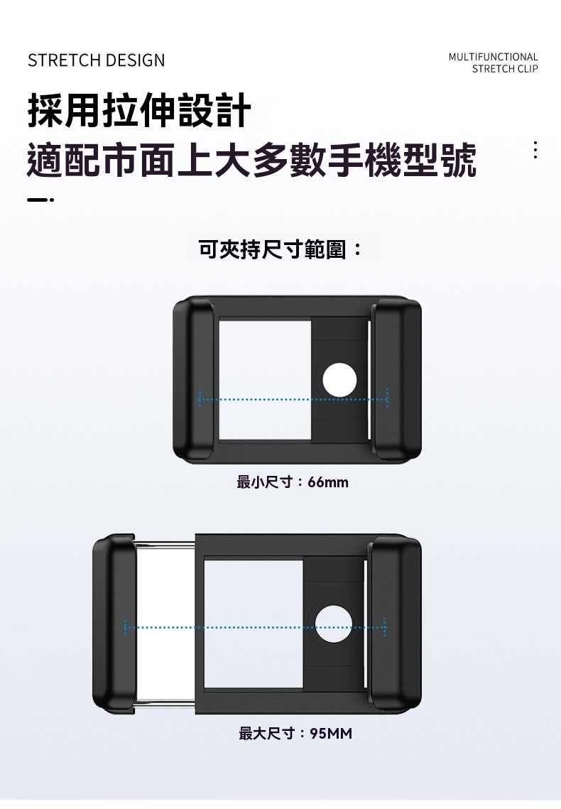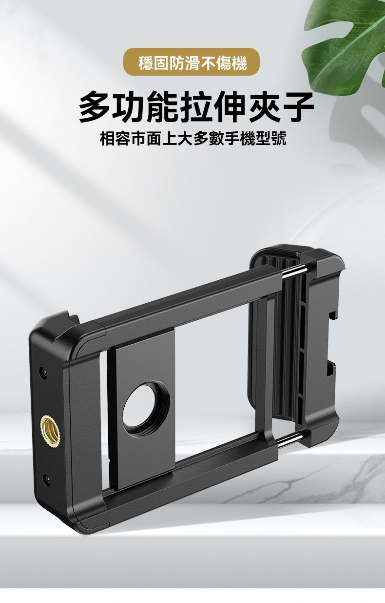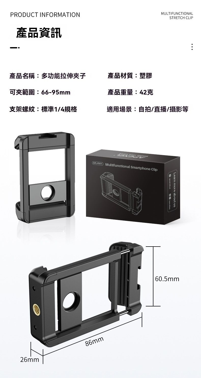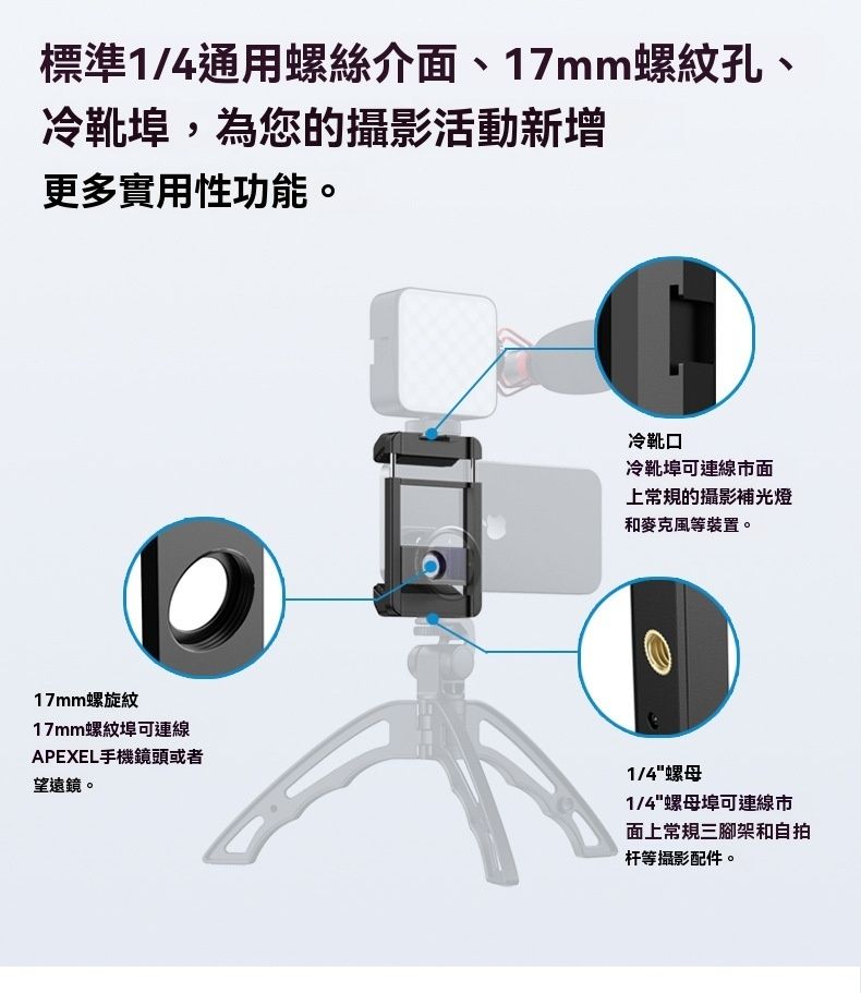 APEXEL F001 手持攝影多功能一字手機夾,是實用的手機攝影配件,適配 99% 主流智慧型手機,伸展範圍 7-10cm,相容厚度≤17mm,夾持範圍 66-95mm。它採用塑膠 + 鋁合金 + 矽膠 + 不銹鋼材質,重 42g,尺寸 85x60x25mm,輕巧易攜。兩側厚矽膠墊防滑不壓屏,矽膠凹槽設計避按手機按鍵,還具自動縮小功能。左右側有 1/4 英吋螺帽與冷靴口,附 M17 螺紋,可接手機鏡頭、望遠鏡,適配 100mm 微距鏡頭、30-60x telephoto 鏡頭等,是手機攝影愛好者的優質選擇。