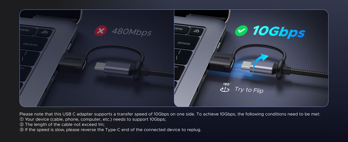 10Gbps 數據傳輸:此 USB to USB C 轉接器支持高達 10Gbps 的數據傳輸速度,是 USB 3.0 的兩倍,為您提供卓越的數據傳輸體驗。注意:要達到 10Gbps 的速度,您的設備必須支持 10Gbps 傳輸速度,並且連接產品的數據線不得超過 1 米。如果傳輸速度未達到 10Gbps,請嘗試將連接設備的電纜端反向插入。