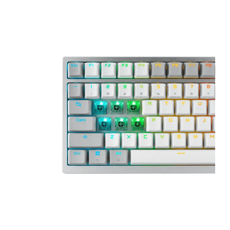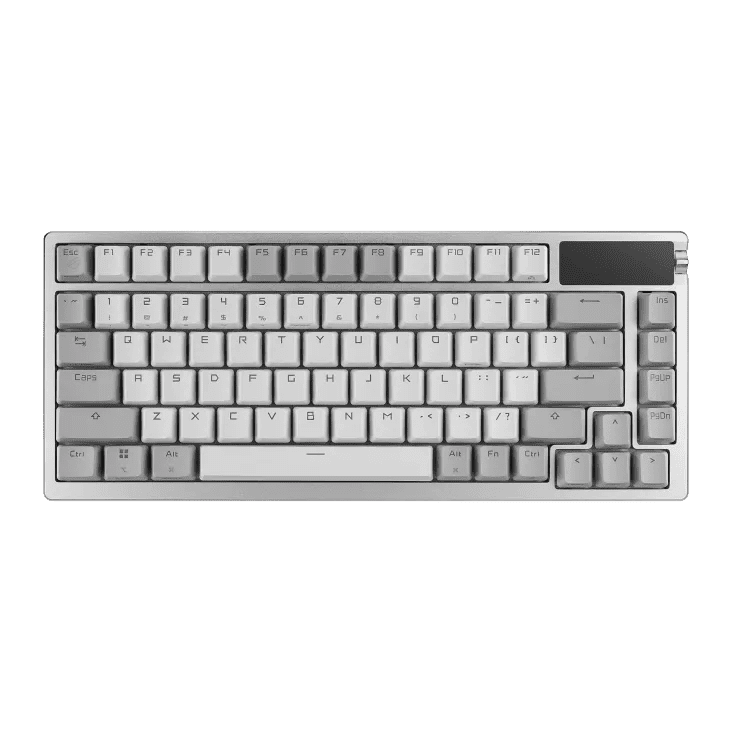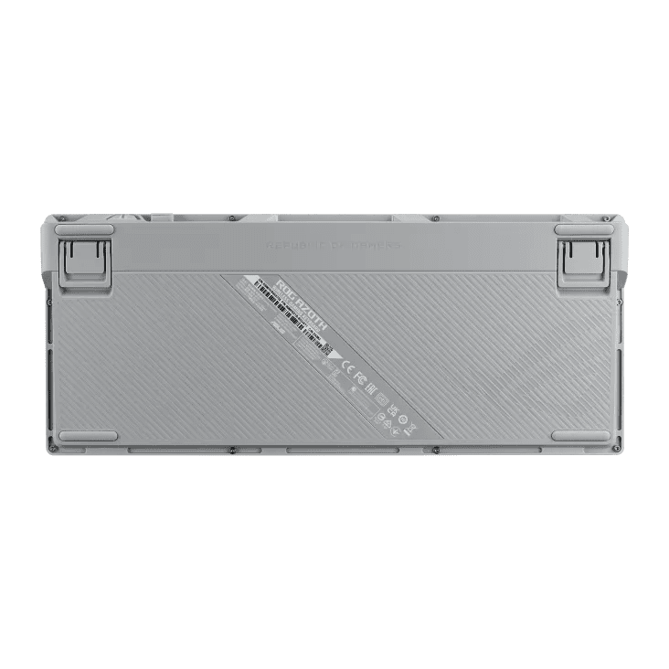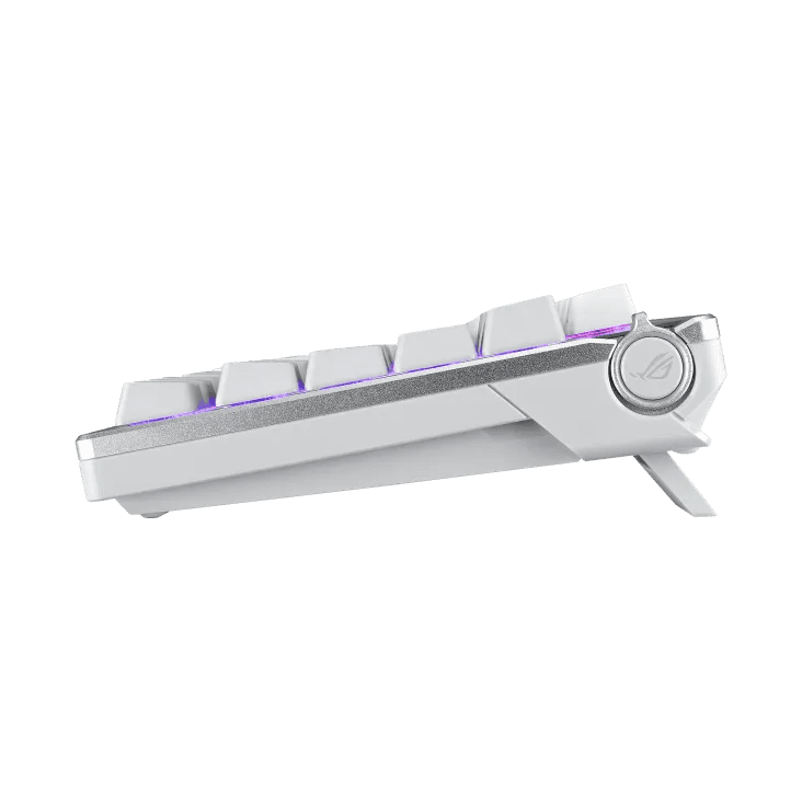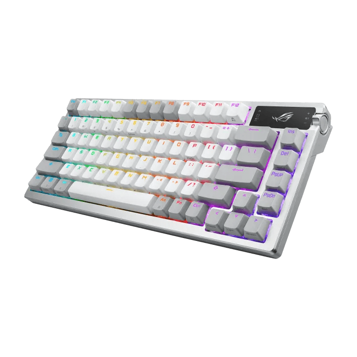 ROG Azoth 75%無線客製化電競機械鍵盤具備矽膠Gasket結構設計、三層消音泡綿和金屬上蓋、可客製熱插拔預潤 ROG NX 機械式鍵軸、ROG 鍵盤穩定器、PBT 二色成型鍵帽和潤滑套件、三模連線含 2.4 GHz SpeedNova 技術、OLED 顯示器、三向控制旋鈕、三種傾斜角度,並支援 Mac。