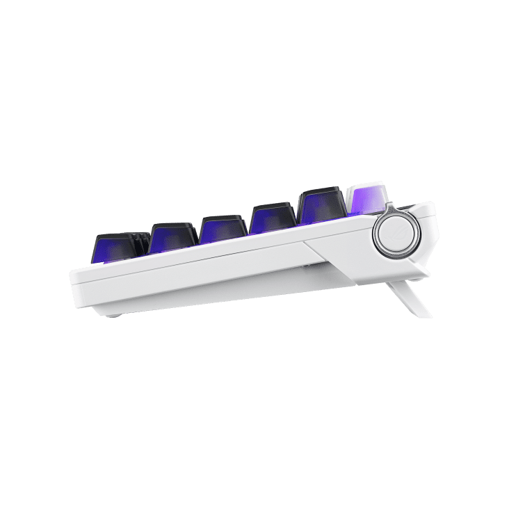 ROG Azoth X 75% 客製化電競鍵盤,搭載熱插拔 ROG NX V2 機械軸、二色成型半透明鍵帽、金屬上蓋、Gasket 結構設計、五層消音結構、FR4 定位板、南向 PCB、具備 ROG SpeedNova 2.4 GHz 無線連接技術的三模連線、OLED 顯示器、三向控制旋鈕、矽膠手托、三種傾斜角度,並支援 Mac OS。