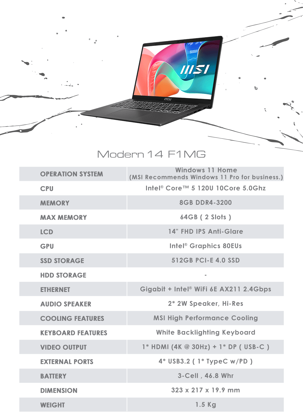 MSI 微星 Modern 14 F1MG C5 14″ Notebook (鉑金灰/Platinum Gray)(Core5-120U/8GB/512GB/Intel)