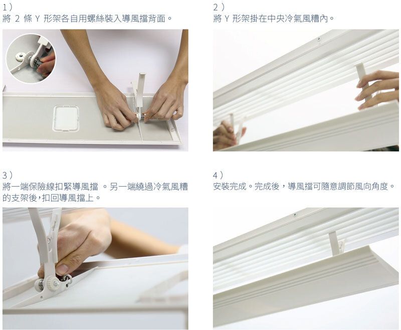採用Y 形架設計,安裝無需工具或鑽孔,直接裝於中央冷氣機風咀及風糟上,不會損壞冷氣機身。另特別配備保險線,安裝後雙重保護,安全放心。