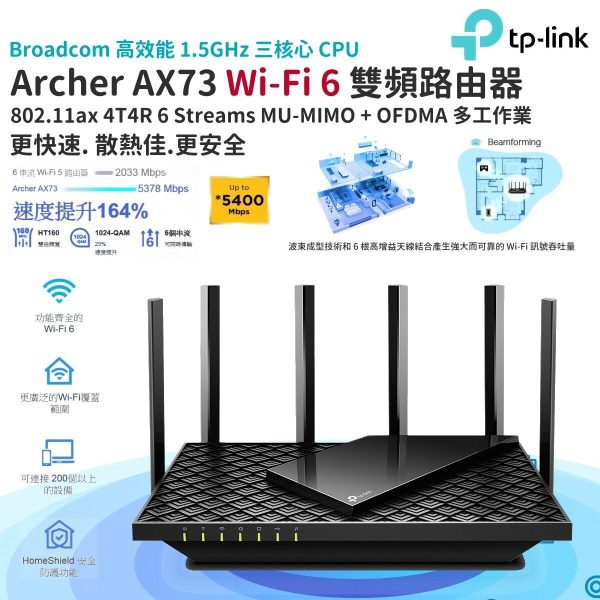Wi-Fi 6 AX5400 等級雙頻無線網路路由器 TP-Link Archer AX73,不僅為家庭使用者、中小型辦公室帶來勢不可擋 Wi-Fi 6雙頻6串流無線網路,更導入全新具備東方禪意的外型設計,兼具大面積散熱實用功能。TP-Link OneMesh 能夠與其它支援此技術的機種共同構築、擴增網狀無線網路,HomeShield 更提供無與倫比的網路安全性與管理機制。