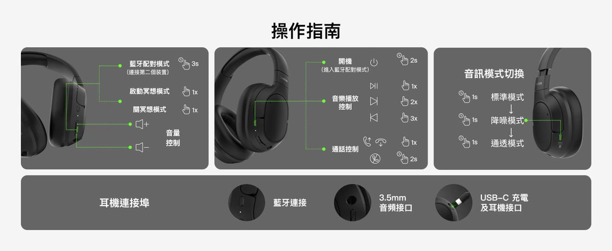 - 聆聽模式選項:Belkin 經典音質、主動噪音取消 (ANC)、通透模式
