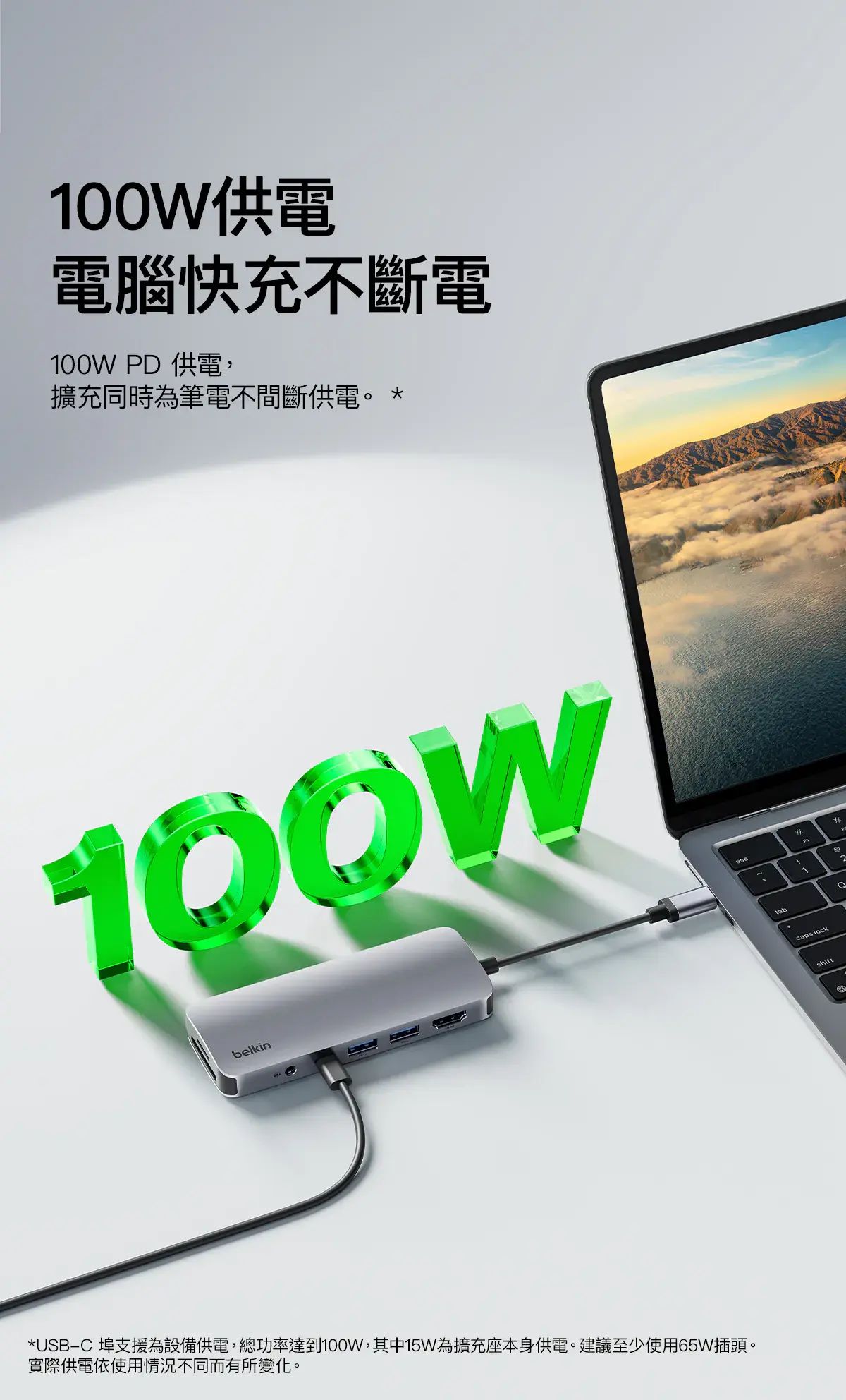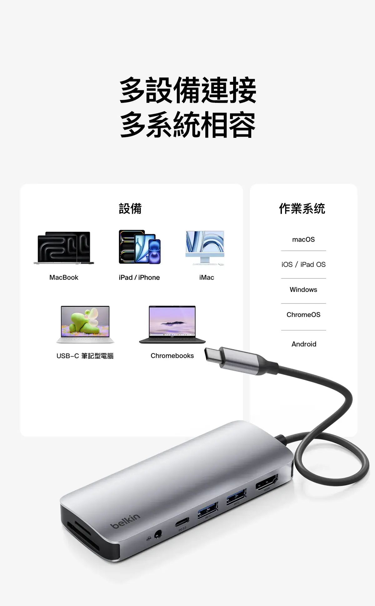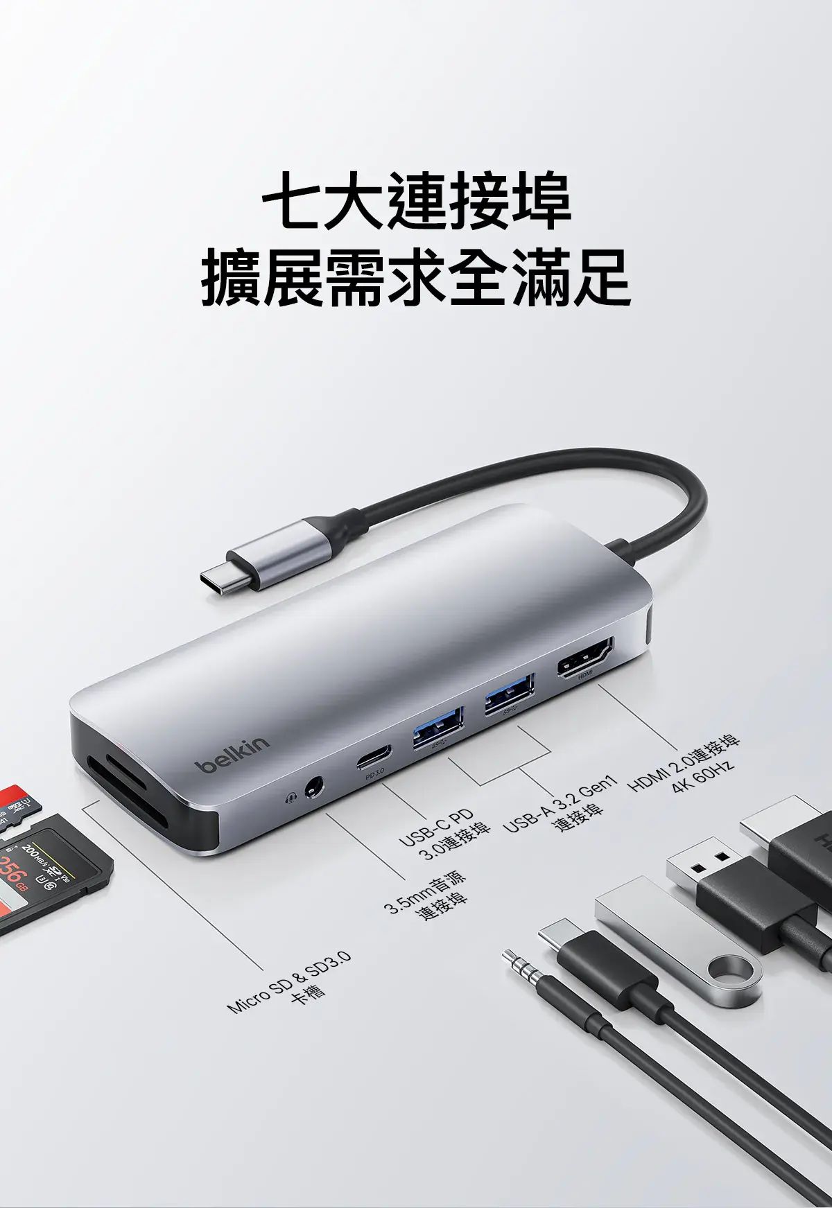 - 只需單個 USB-C 連接埠即可將手提電腦連接到 HDMI 連接埠、SD 和 microSD 卡插槽、1 個 USB-C PD 3.0 連接埠,以及 2 個 USB-A 連接埠