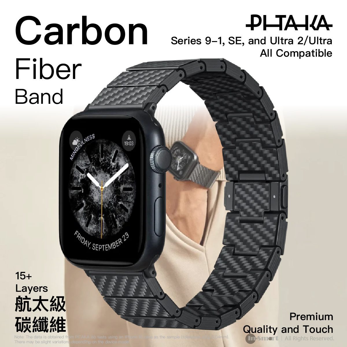 PITAKA 的手錶帶每個鏈接均由超過 15 層的 1K 碳纖維布製成。經過複雜的模具技術加工,這些碳纖維手帶提供精緻的質感和質量,超越其他同類產品。