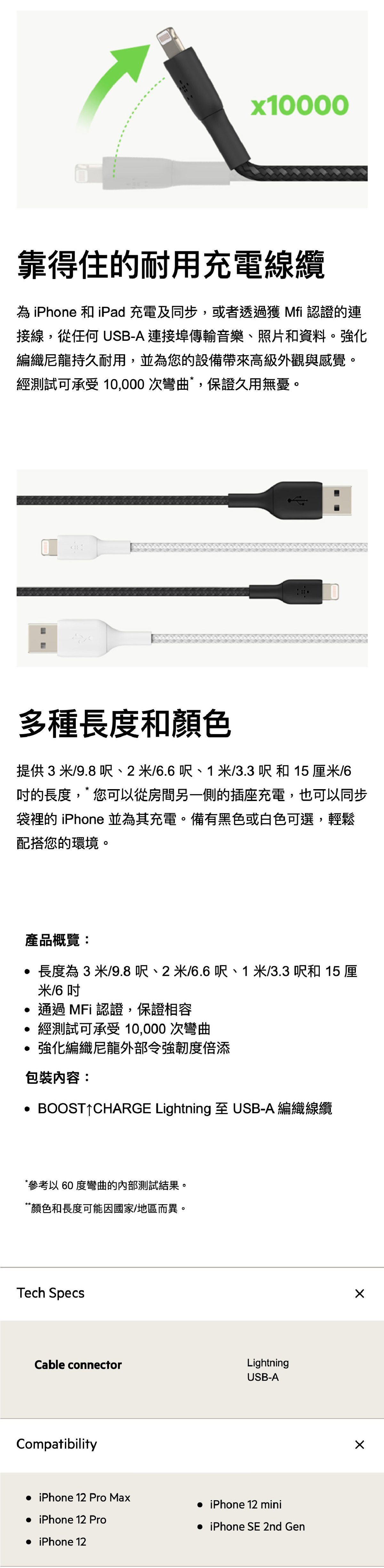 為 iPhone 和 iPad 充電及同步,或者透過獲 Mfi 認證的連接線,從任何 USB-A 連接埠傳輸音樂、照片和資料。強化編織尼龍持久耐用,並為您的設備帶來高級外觀與感覺。經測試可承受 10,000 次彎曲*,保證久用無憂。
