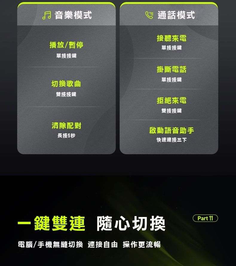 通話模式:接聽電話(單擊)、拒接電話(雙擊)、清除配對(長按5秒)、喚醒語音助手(三次點擊)。