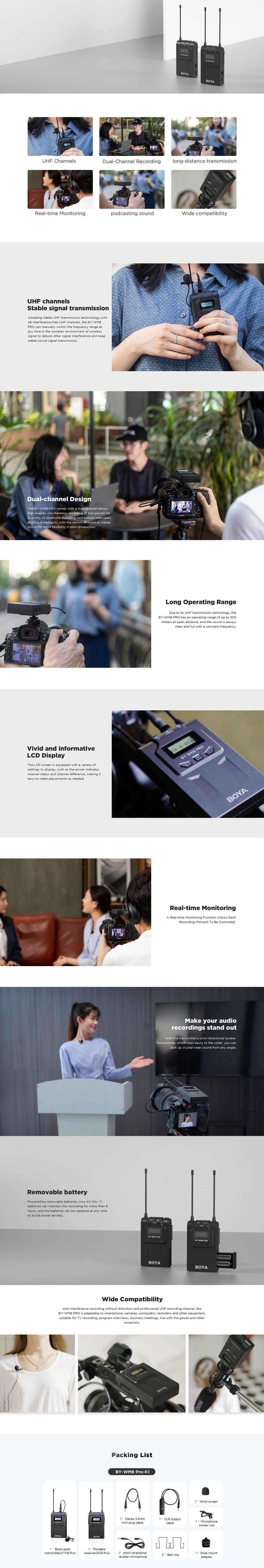BOYA BY-WM8 PRO-K1 領夾式麥克風是一款專為無線捕捉音訊而設計的無線麥克風系統。這款高品質無線麥克風系統旨在提供卓越的音訊質量,確保您的錄音和廣播聽起來清晰且專業。