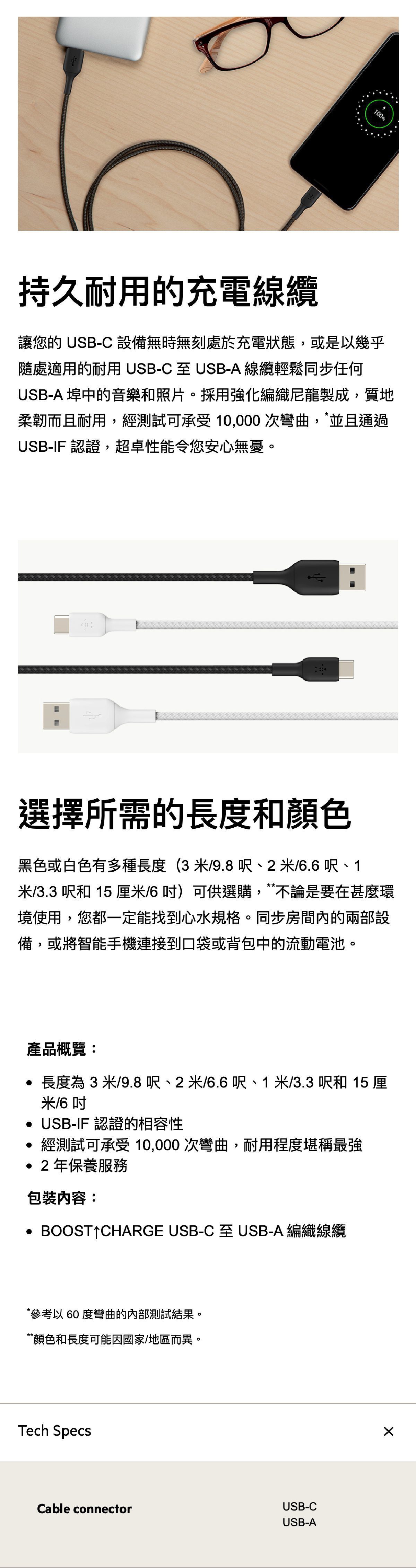 讓您的 USB-C 設備無時無刻處於充電狀態,或是以幾乎隨處適用的耐用 USB-C 至 USB-A 線纜輕鬆同步任何 USB-A 埠中的音樂和照片。採用強化編織尼龍製成,質地柔韌而且耐用,經測試可承受 10,000 次彎曲,*並且通過 USB-IF 認證,超卓性能令您安心無憂。