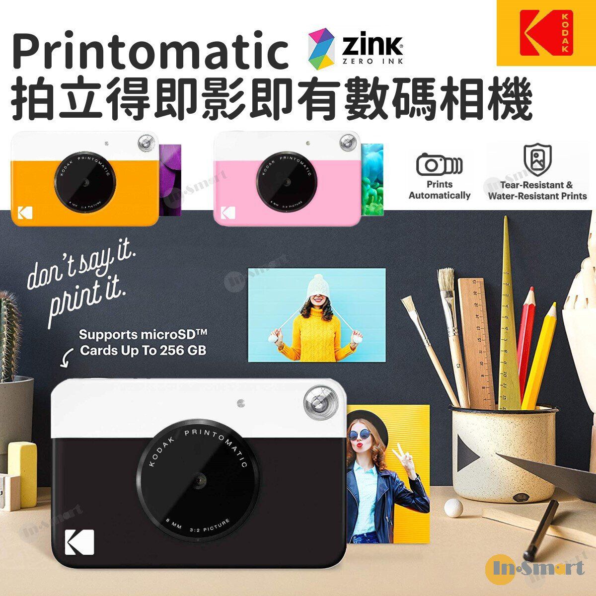 柯達 PRINTOMATIC 將即時打印的樂趣與數碼的便利相結合,是一款可以製作即時 ZINK 打印的數碼相機。使用 2MP 圖像傳感器和廣角 f/2 鏡頭,相機記錄數字圖像,然後自動打印為 2 x 3" 打印件以供分享,並保存到 microSD 卡中。相機的簡單即取即拍設計具有用於直觀構圖的光學取景器,具有黑白和鮮豔色彩的拍攝模式,並具有可在低光照條件下工作的內置閃光燈。內置可充電鋰離子電池可通過 USB 充電和集成指示器可用於指示電池電量低、打印介質和存儲卡存儲水平。